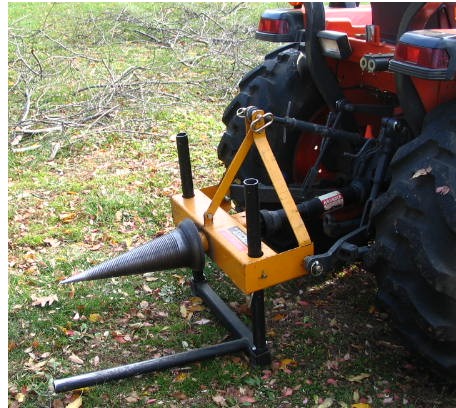 Now what you need is one set up like a post hole digger with anti rotation bar along the side. You drag the log onto a level open space and cut to fireplace length with chainsaw but leave it lay in a row. Back the tractor over the log and lower the screw into each piece as you move along the length of the cut log... The only time the wood gets picked up is when it gets stacked and you could probably pick it with a loader bucket. This method would be limited by the diameter of log you can drive your tractor over but would probably be pretty fast. HMMM I wonder where you can get one of those screws...