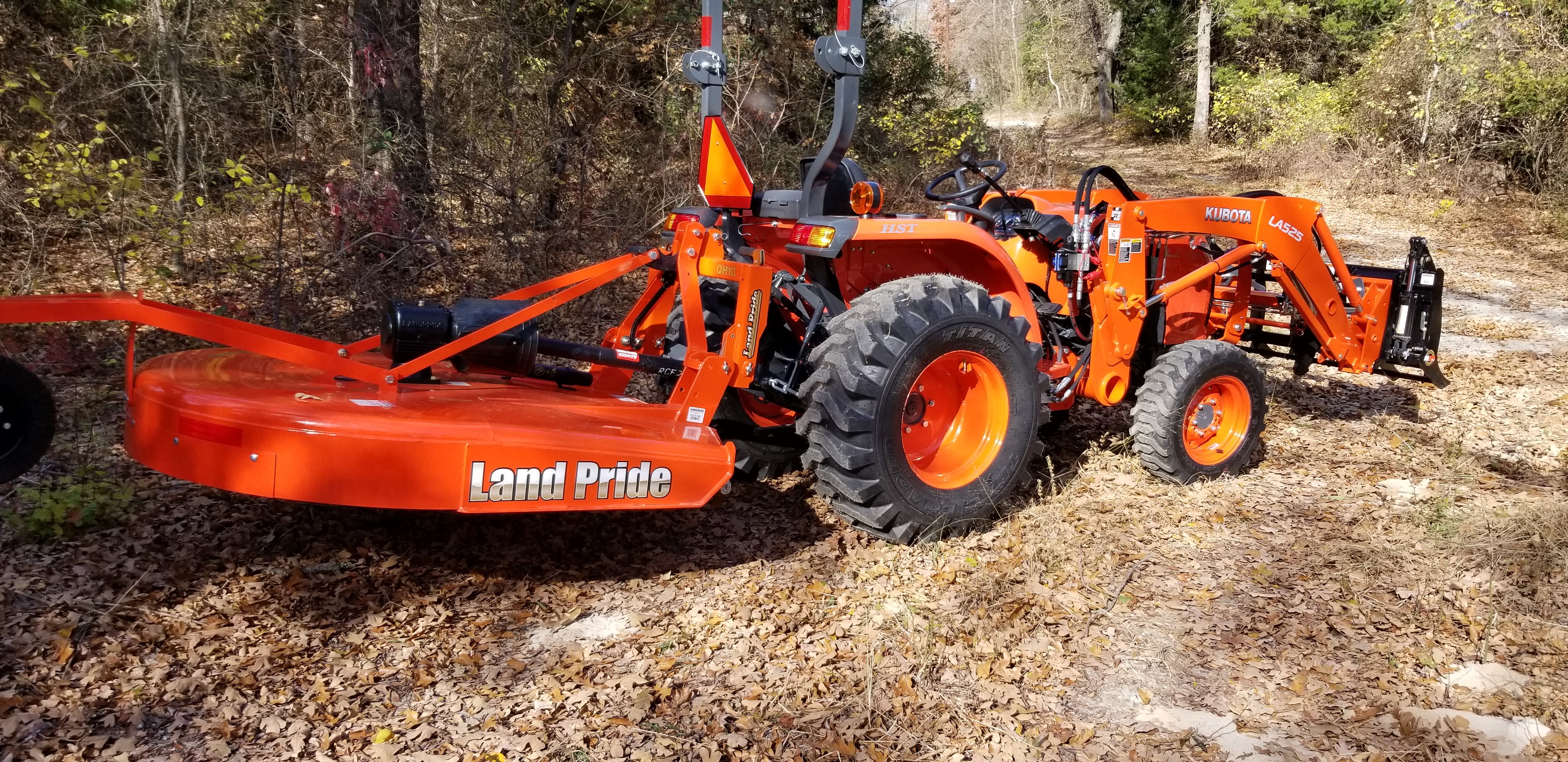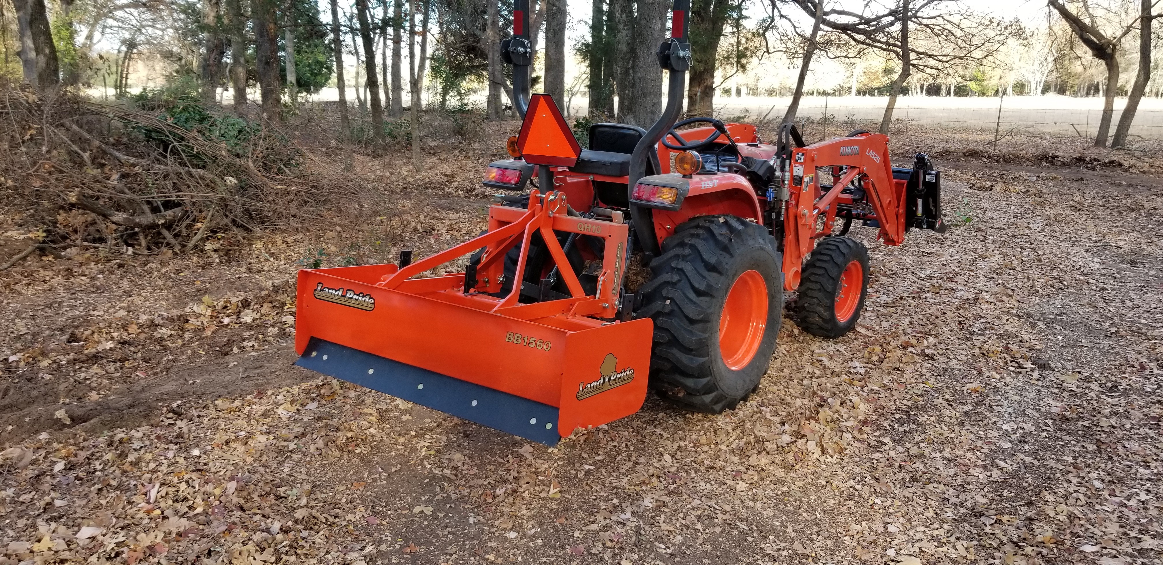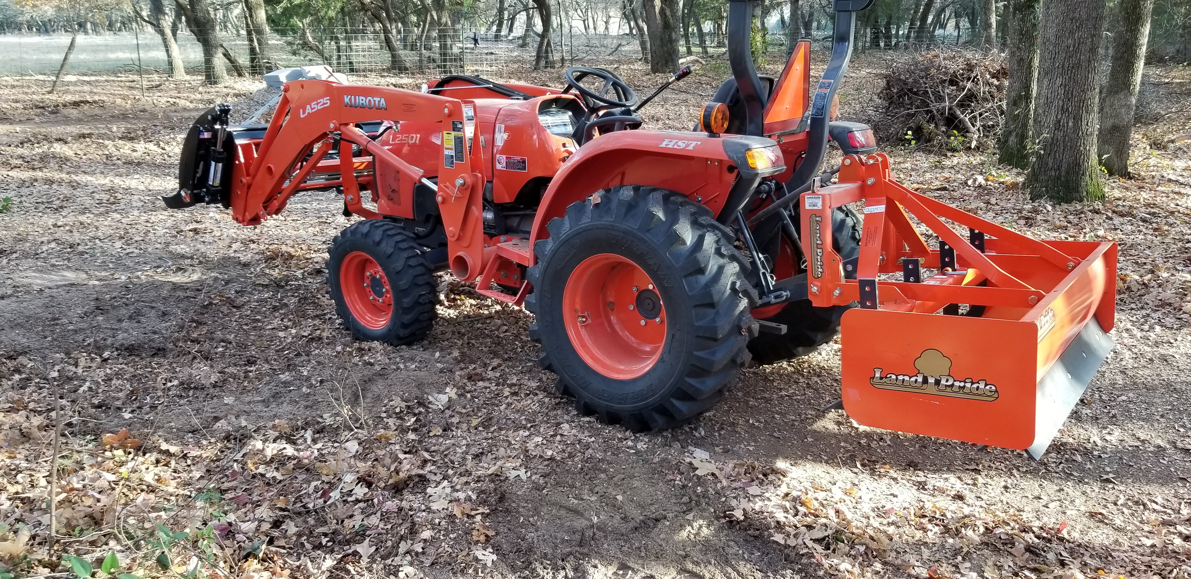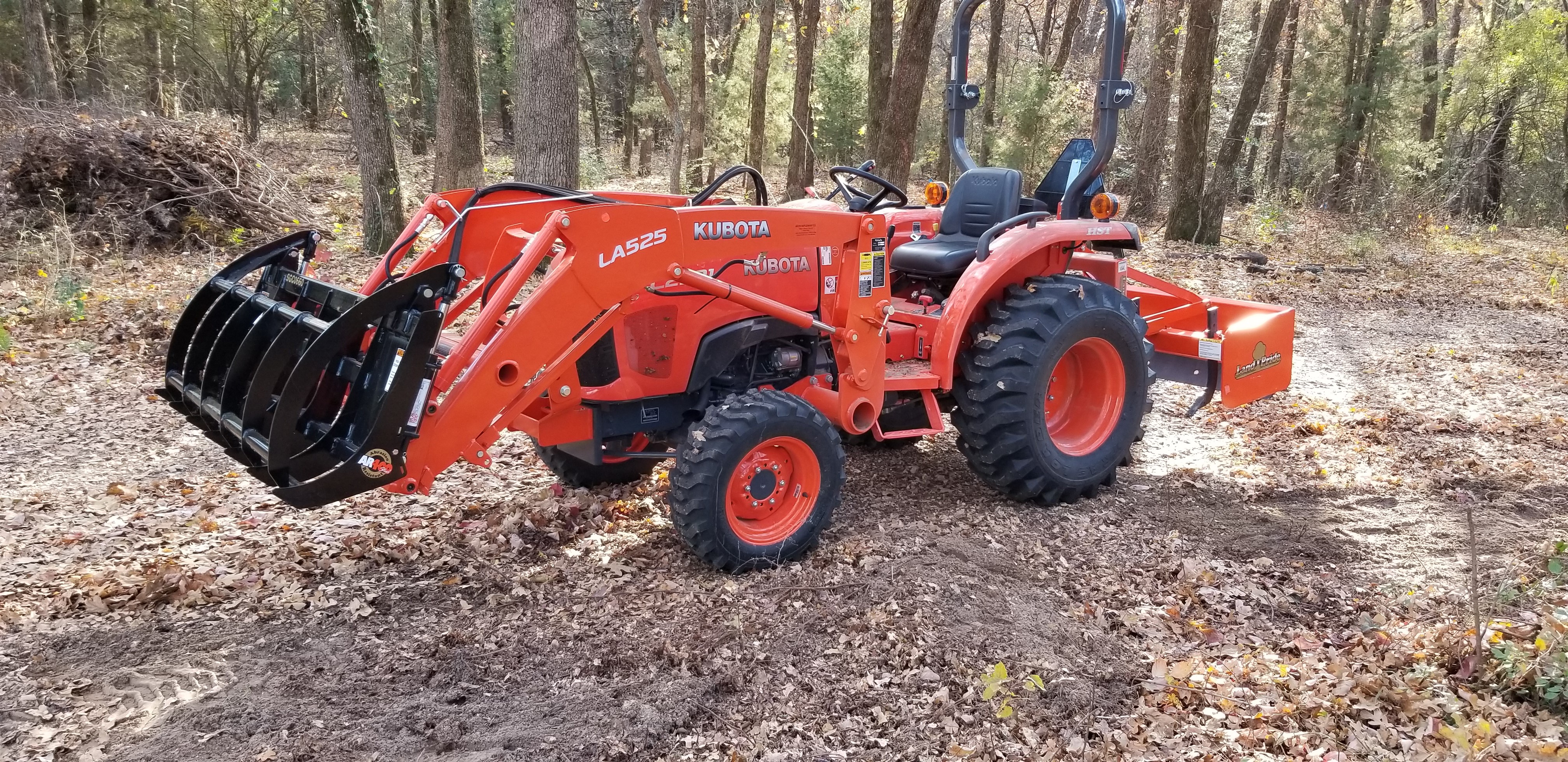 Well, thanks for all the useful information on this forum guys! My search has ended and the purchase has been made. I will say that I strongly considered Kioti and Deere. At one point, I was 90 percent sure I was going to buy a tractor of each of these three brands. I was initially set on a Kioti CK3510SE. Then started looking at Deere. For whatever reason, the 3025e looked about as sensible as the two larger HP tractors on the same frame. I had to have a conversation with myself and ask if I really needed the 35 HP machine considering I am not mowing grass. I'm mostly clearing underbrush on a heavily treed tract and doing a lot of loader work. After re-calibrating myself to the 25 HP machines, the Kioti no longer appealed to me as much for whatever reason. The Deere, though there is a lot to like (including the plastic hood and fenders IMO), was just too lightweight compared to everything else on the market. The Deere also has the most anemic loader with only one movement (lift or curl) available at a time. Kioti has the strongest loader...but it was pretty jerky and Kioti only publishes the lift capacity at 1.5 meters off the ground (about 1800 lbs). Kubota publishes the full height at about 1100 lbs and is about 1400 lbs at 1.5 meters. So they are much closer than appears on the surface, with the edge still going to Kioti. Given the closer parity on the lift, I like the smoothness of the Kubota better. The Land Pride third function on this thing is nice too. With a grapple, it will open/close the grapple, curl and lift - all at the same time! I verified this hours ago on the demo machine on the lot. It's no speed demon when activating all three functions at once, but it IS the bee's knees.