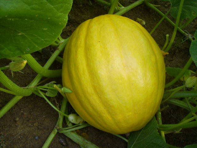 Another picture shows a rather large Howden pumpkin that has developed. It is yellow in color. My expectation was that the pumpkins would go from green to orange. I'm not sure if this yellow coloration is natural or is caused by some sort of disease. The plants and yellow pumpkin look healthy so maybe it's a natural occurrence. I haven't found an abundance of young pumpkins yet, but there are probably many under there that are just hidden by the thick foliage.