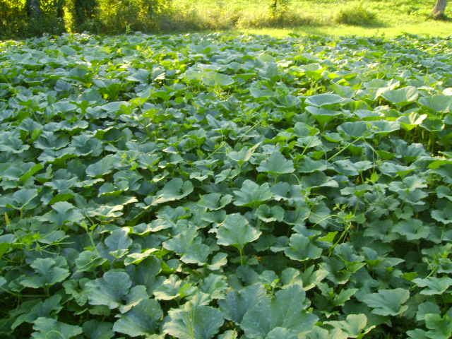 You were asking about beetles later in the season when the vines are large. Beetles pose the most danger when the plants are just coming up because (1) they can eat everything down to nothing being left and (2) they vector mosaic virus which can ruin most of the crop. Beetles are more attracted to some varieties than others. They definitly prefer things like Hubbard squash, turban squash and Big Max/Prizewinner types which are a different species from regular jack-o-lanterns. I have seen some farmers plant Hubbard Squash or Turban Squash at the field edges as a trap crop and then zap them with insecticide.