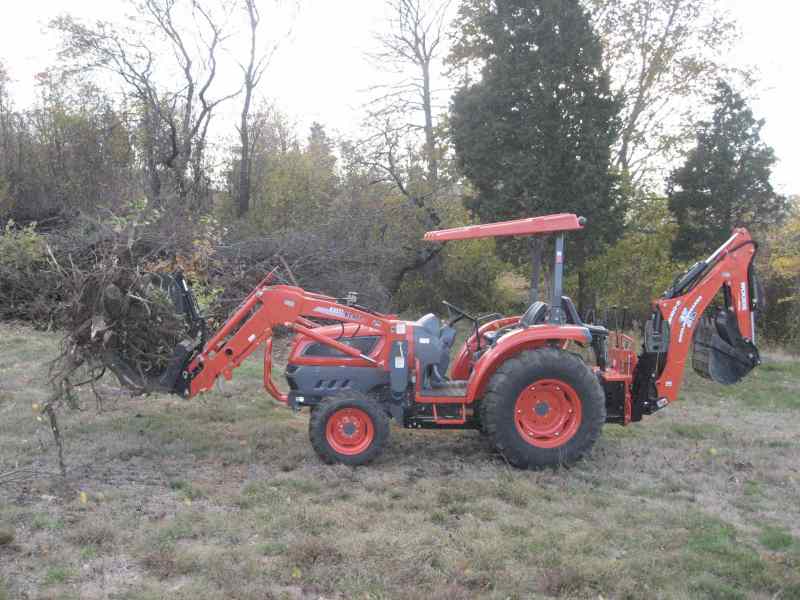 I'll try to find some photos of a grapple/tree battle but it is actually easier to describe. For starters there is a lot of variation and unless you are taking out pretty much identially sized trees from the same area you will need to experiment a bit to find the most efficient method. It also depends a lot on what your loader capacity is. I have removed trees with my smaller Kioti CK20 very successfully but it often required different technique and more time than when I use the larger DK40se.