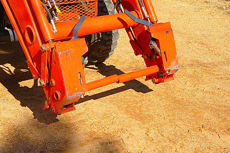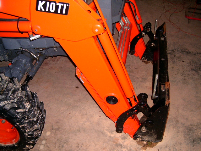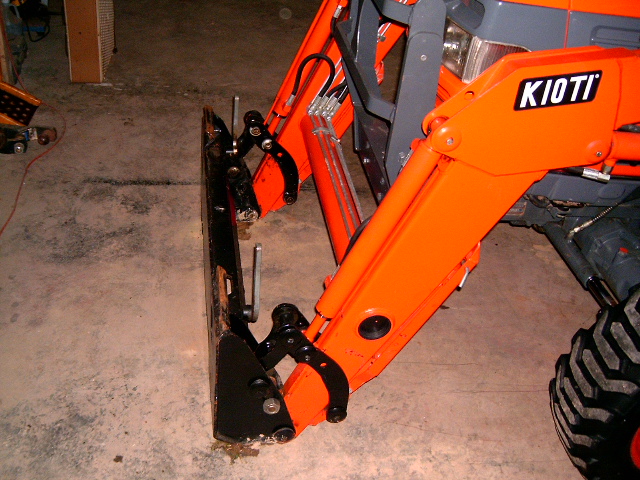 Switching over to the quick-attach system isn't going well for me. The QA adapter wasn't made quite right, there wasn't enough space for the bucket cylinder crosstubes; and now that I've got that fixed, it turns out the pallet fork attachment I got (at the same time,from same seller) doesn't work with the QA adapter - the angle is wrong. At full rollback, the forks tilt down at about 11 degrees. The bucket fits better, it sits flat on the ground at full rollback (the OEM bucket tilted back a little).