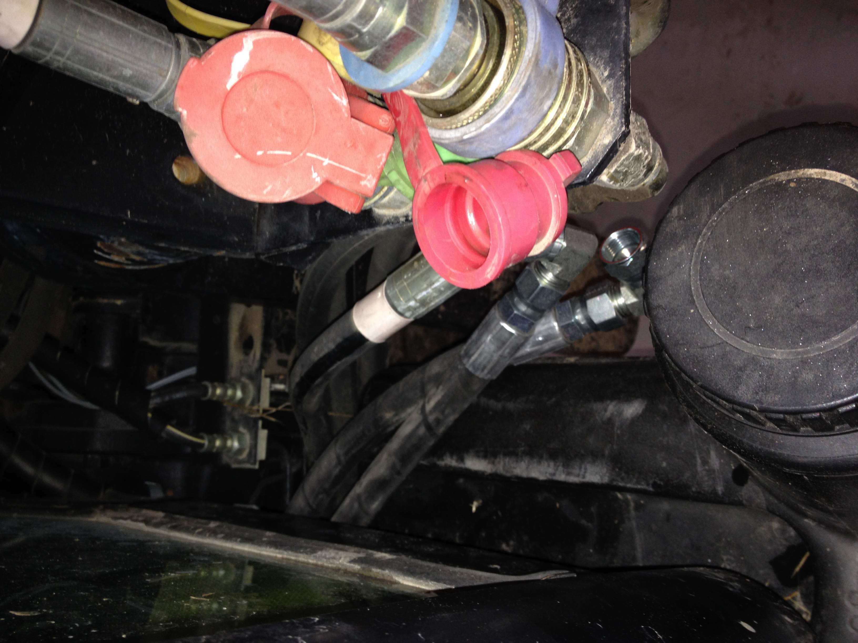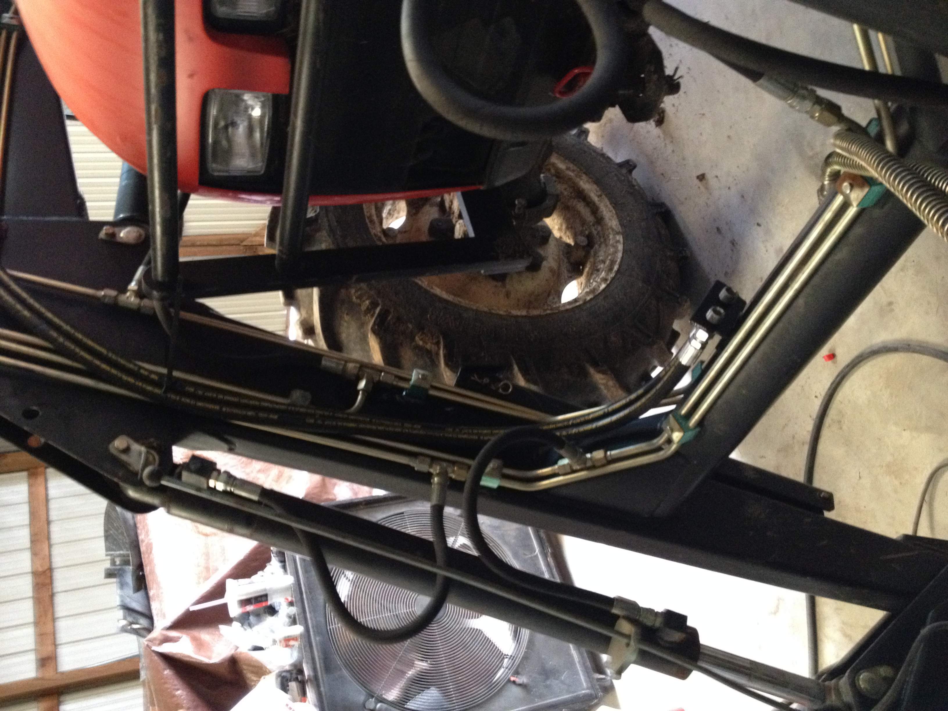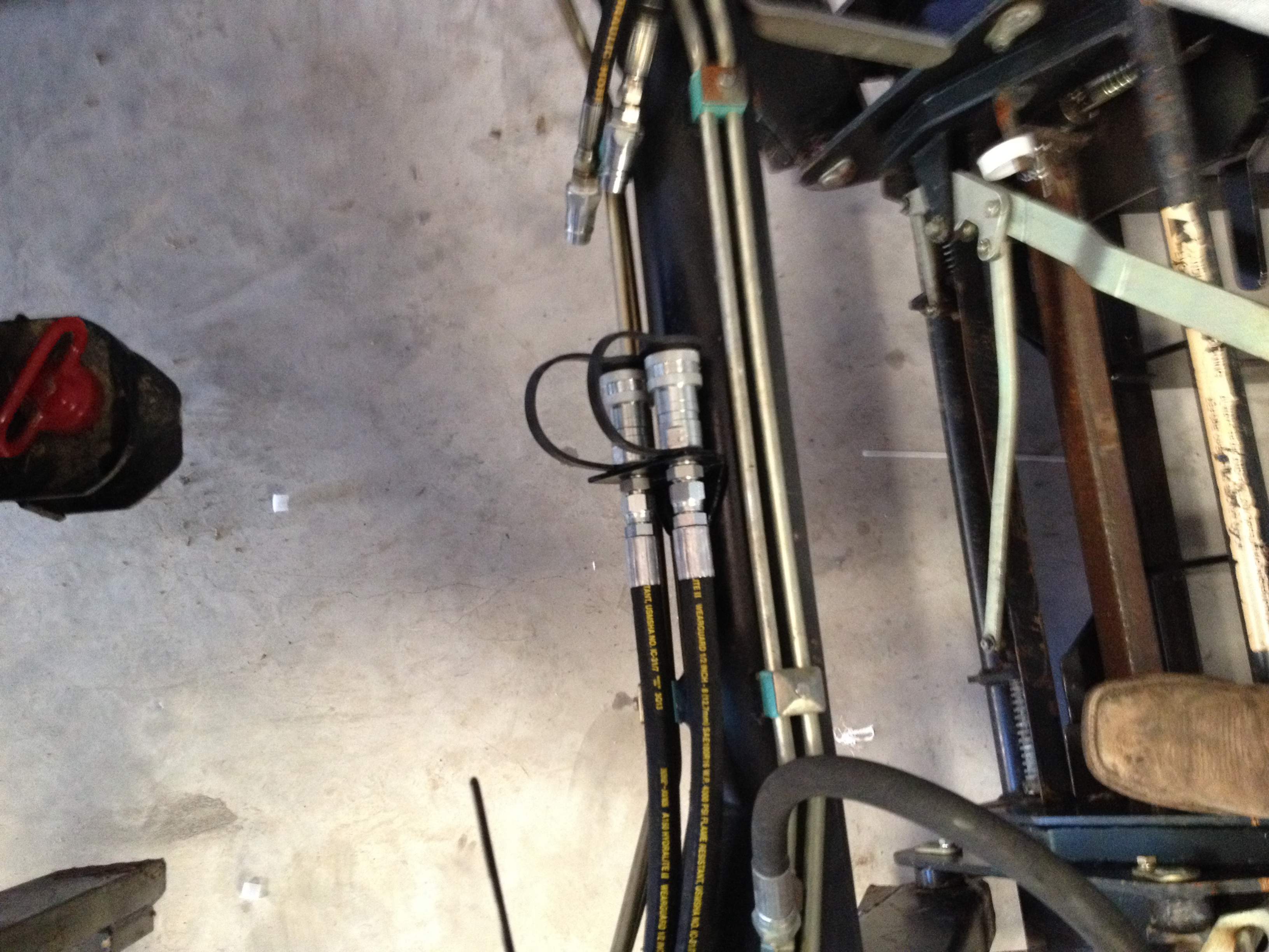 This is a spin off of my original post "Need help deciding on a grapple". I purchased almost all my parts list from the Surplus Center, the only thing I didn't purchase from SC was the QDs... I found a set of 6 QDs on ebay cheaper than 4 sets on SC website. I decided to put QDs at the FEL disconnect and at the torque tube both rigid mounted. I'm glad I put the QDs at the FEL disconnect because it wasn't easy routing the 1/2" lines under the cab. I took MtnviewRanch's (Brian) advice and tapped my brackets with 1/2 NPT tap to thread my JIC to NPT adapters into so I had a nice tight secure fit at the QDs. All in all the project was fairly simple and I really appreciate everyone suggestions from my previous thread. The entire project came in at 245.00. Here's a few install pics: