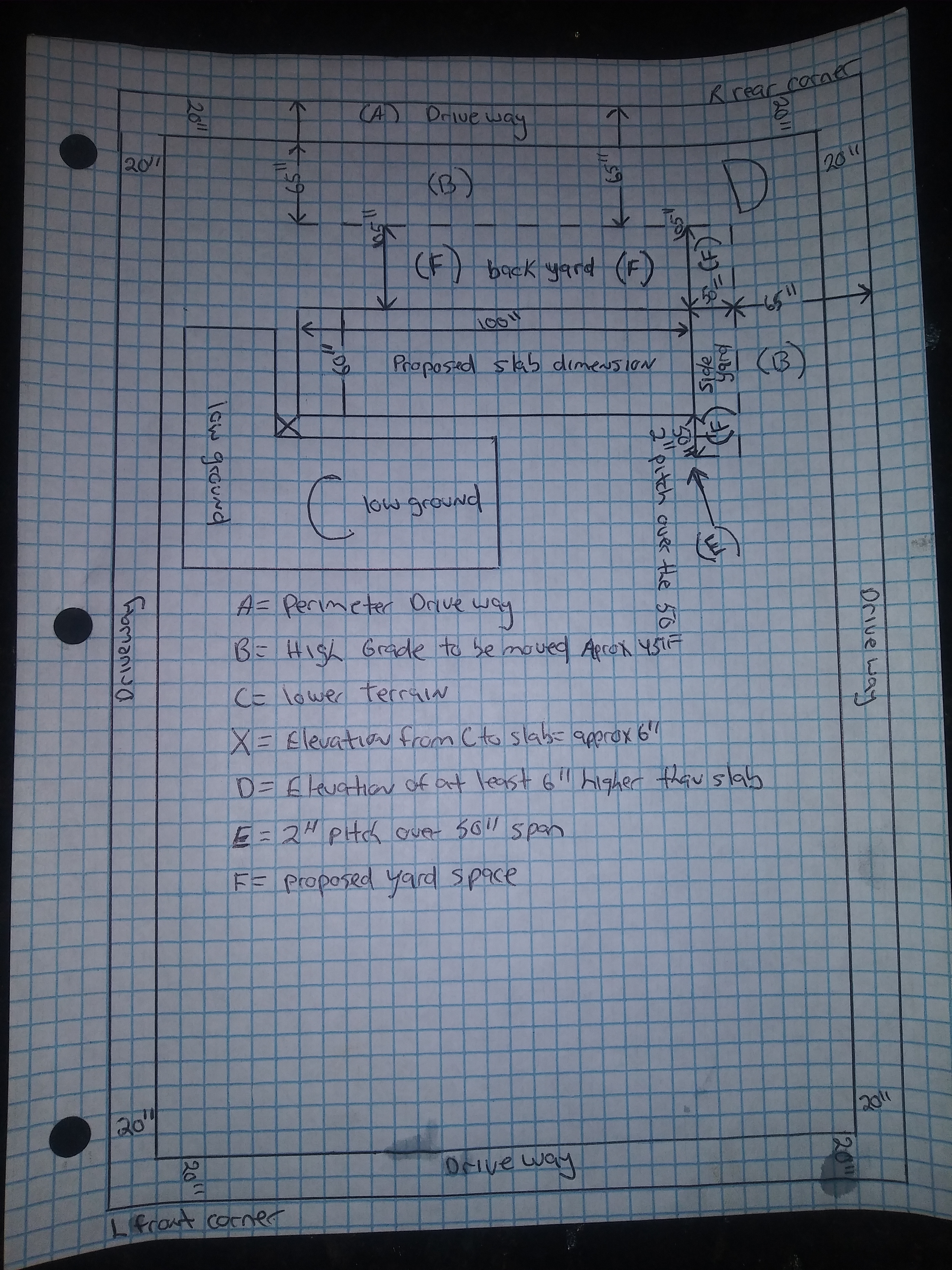 B indicates the area where I will be removing dirt ( pure sand ) because it is a much higher elevation than the proposed slab and I dont want to look at a hill behind my shop/home. I have been moving this material ( D is at least 6 ft higher in elevation to the slab ) down to the area marked C.