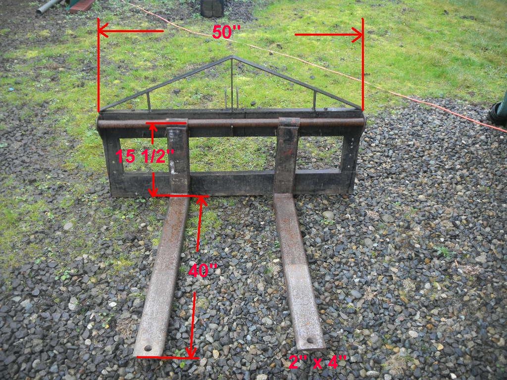 Here's a set I built about 15-years ago. Used 2" x 4" rectangular tubing. They will fit on the FEL, or the 3-PH. I've used shackles and chokers in the holes at the tips, and stalled the FEL. About 1,400- pounds of lift.