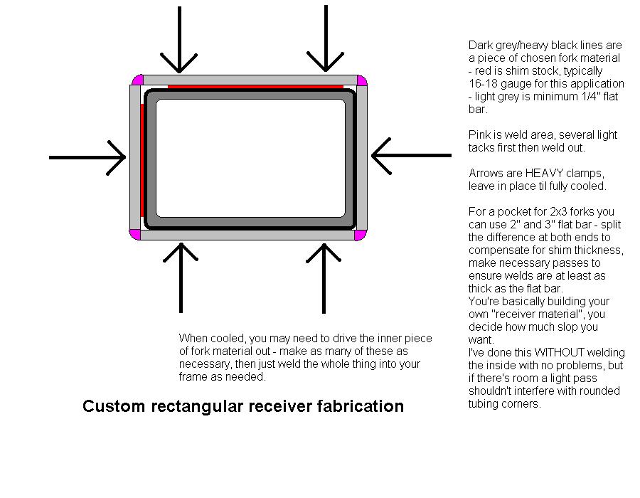 You can use tubing with slop. It actually works better in the end. You weld "beads" on your fork tines at the four (or 6) contact points. Grind it flat to the proper thickness. This too is dependent on the craftsmanship of your neighbor, but it's very easy to do and takes a fraction of the time to construct the sockets, which will NOT be adjustable.