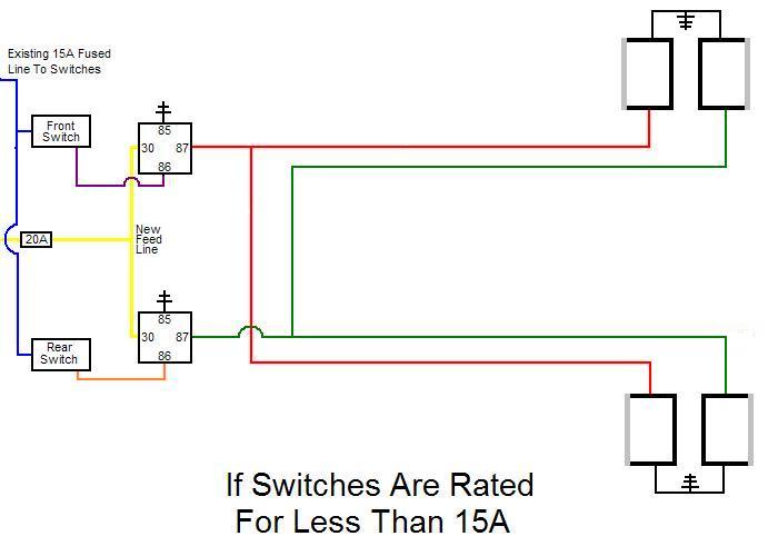 Any basic Bosch-type relay will work. You can get them at any automotive stores. Some carry the molded male multiplug/pigtail, but that can be hard to find. Shielded spade connectors would work fine, too. If you go the relay route, I made a wiring diagram for you below. The new feed line would be wired directly to the battery.