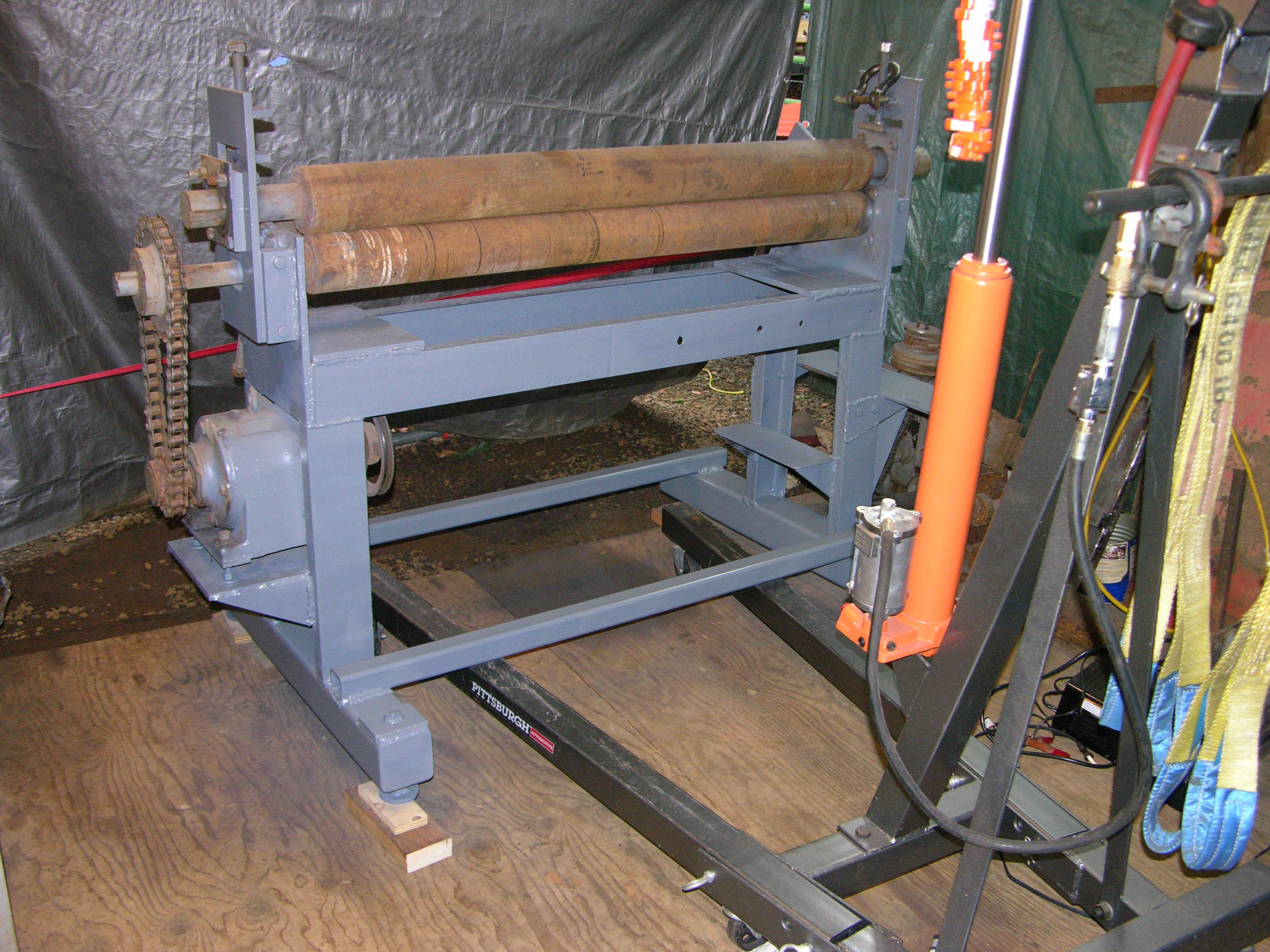Here's a pic of the cherry picker helping me to fab a better base for a CL find - this slip roll will handle 1/4" plate without a grunt, and will roll 1" steel up to at least a foot wide. Note the replacement air/hydraulic jack on the cherry picker - DSCN1243.jpg