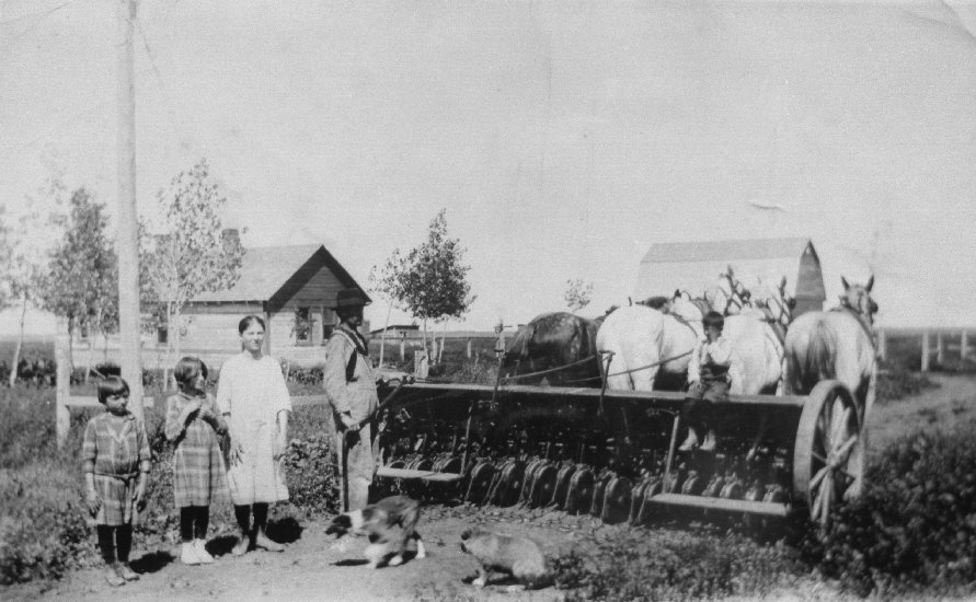 Here is the telling picture, this is from the back. After I loaded it on the computer, I zoomed in and you can see a very faded "John Deere Van Brunt" painted in yellow on the backside of the seed hopper. From this angle you can easily count the nine seed drills and discs. Also, you can see the wood stepboard that goes across the back of it. I know you mentioned it was to stand on for loading seed (which would make it easier I am sure) but I did see a picture of a grain drill similar to this one that was being drawn by a horse and the operator was standing on the stepboard. So, I guess it served two purposes.