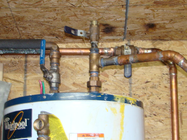 With the pump off and the fire started it takes roughly 15 minutes for the fire to get hot enough to start the natural flow of the heated water wanting to rise. The only way it can rise is out the 1" copper outlet pipe that is roughly 10' long that dumps into the side port of the water heater tank where the pressure relief valve was. I still have the safety valve there I just added a Tee there for the valve to sit on top and the water to run straight in. I have a Tee at the bottom of the tank where the tank drain valve was the drain valve is teed off with the cold water running straight out of this tee back to the in port of the ss stove top heater.