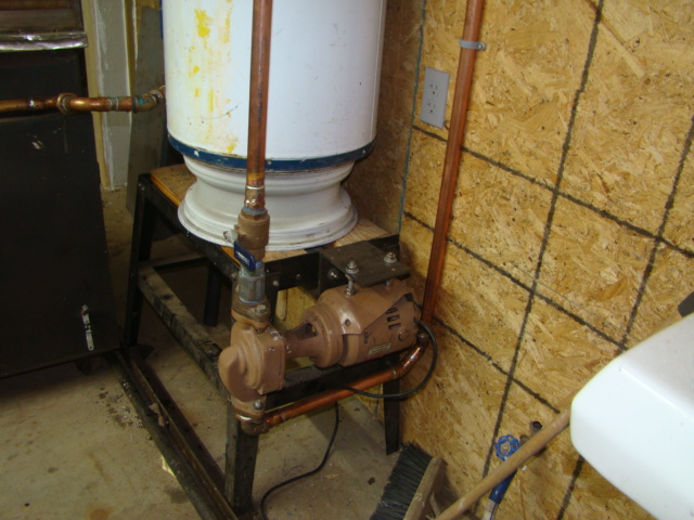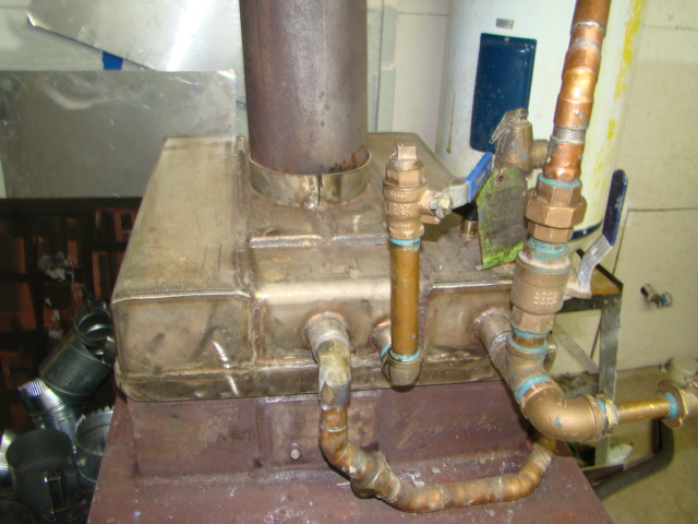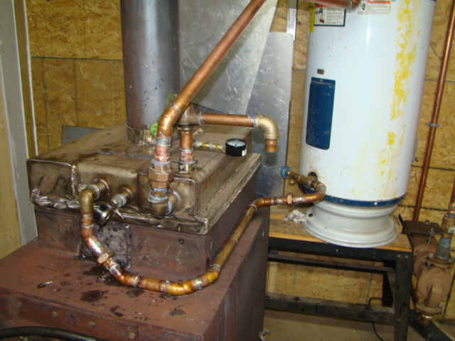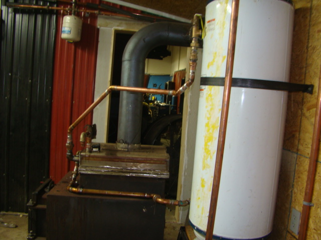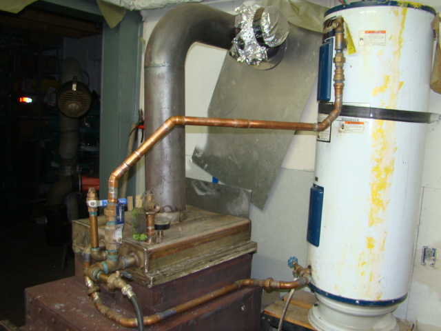 What I have is a wood stove with a ss tank attached to the top of the stove with the exhaust going out through the center of the tank. The water goes in one end and travels around the sections and out the other end. As the water heats up and leaves the SS tank it rises up a section of 1" copper pipe to a 35 gal water heater. This heated water dumps into the top side port where the pop off valve was and then back to the stove through the old bottom drain port of the hot water heater.