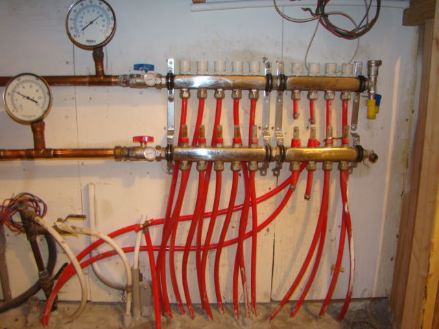 As it is now I'm dumping roughly 100 degree water into the manifold, that is connected to roughly 2000 ft of 1/2" pex and by the time it leaves the return manifold it is cold or around 50 degrees. After a couple days of keeping a good fire all day The center sections of the shop floor will warm up 65 degrees in places and cool off as it gets to the outside walls where they stay on average around 50 to 55 degrees.