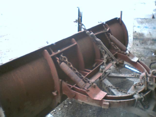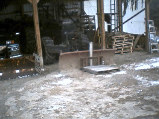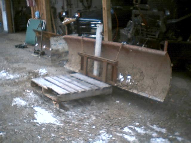 I needed to move some pallets and had already put the blower on the back of Max. I've been thinking about making brackets to mount my 3 pt hitch forks on the plow blade, got looking at it and thought for a fast and dirty job, chain will do the same as brackets. Here's the results. The long channel iron in the center is my 3rd point when using on the back. Just never got around to cutting it off and also I have holes at several heights in it so I can vary the tilt when raising it. That works well with pallets of firewood as I can lean them back while picking them up. I just put a chain binder on the 3rd point to keep forks from tilting down when lifting. It worked good but eventually I will make brackets so I can just hang it on. This should work even to turn your pickup into a fork lift. Don't know how much they'd raise though. The worst