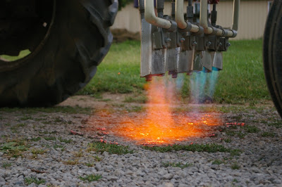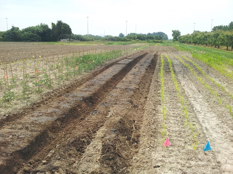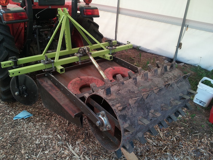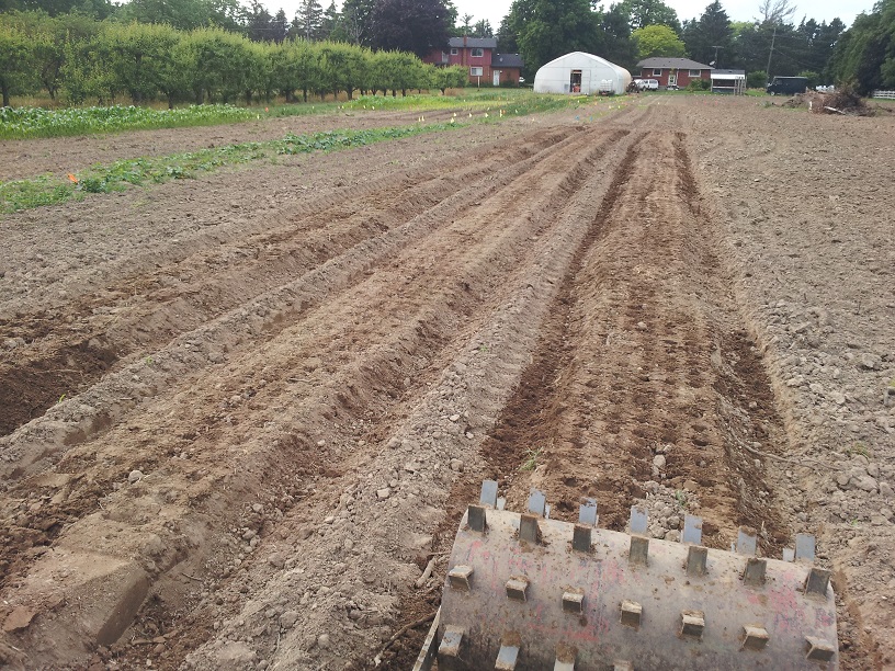 While just changing the geometry of the spikes would have almost been enough, we wanted something a little better. A neighbouring farm was out prebedding with their raised bed maker (prebedding is when you make a bed in the field with no plastic before going over it again with plastic...makes a firmer and more even raised bed for the plastic and keeps it tighter), I asked if I could try my wheel on the beds and it made a significant difference running the spikes over a slightly packed, more level surface.