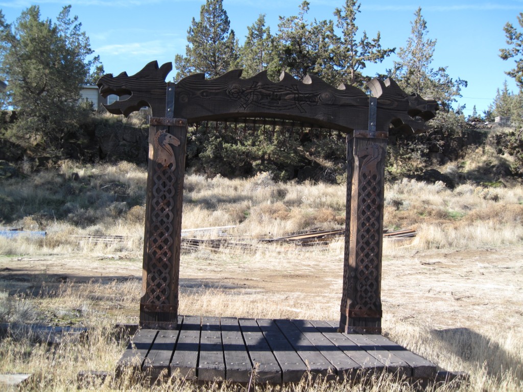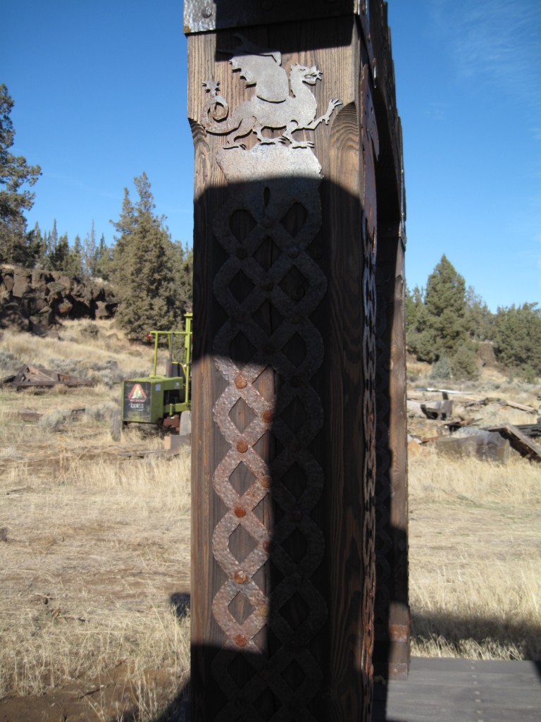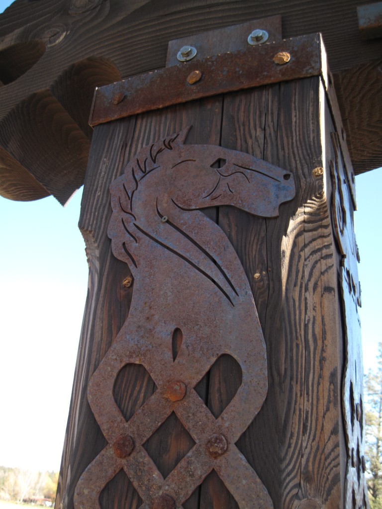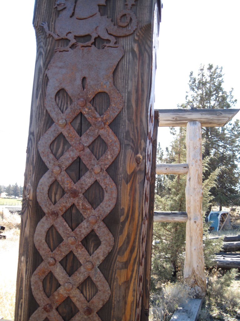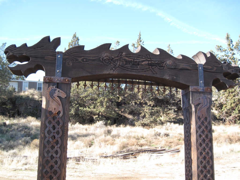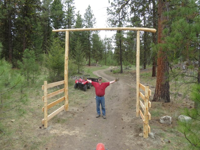 I am the one that originally started this thread in 2007. Since that time I did complete my entrance. The picture shows how it turned out. It is not nearly as elaborate as the ones shown in other posts in the thread, however it did turn out to have the look I wanted and cost me virtually no money. It is made from cedar trees cut on the farm. I also made the gates. That did cost a little but not too much, less than cheap metal farm gates and much better looking I think.