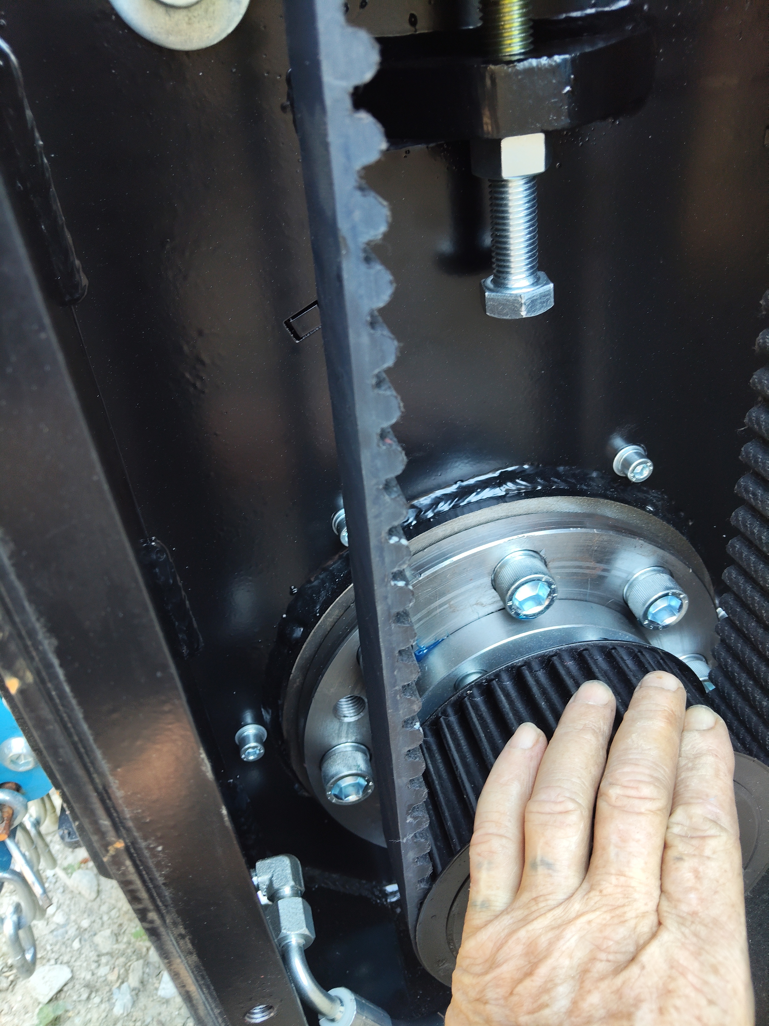 3. Before you loosen the 4 bolts that are holding the drive check the gap between the frame and the edge of the motor. Mine was .037. I used a set of feller gauges to do this, and used them to support the motor during reassembly. I was able to do this because I layed the mulcher down horizontally to do the job. ( I guess that should have been step 1 but I am going off memory )