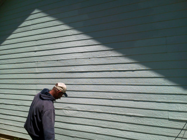 Every once in awhile I get a request from a customer to do a little out of the ordinary repair. This customer had paid two handy men to replace this water damaged siding and never saw either one of them again. With no contractors licenses required around here to maintain accountability and a level playing field, it's really a free for all. My FIL stripped off the damaged material and found that the sheeting had only been corner nailed. :rolleyes: After securing the sheeting with screws along the edges and in the field, he put in a trim board as a break between the old and new siding, then caulked and painted the entire backside of the shop. Since the company that originally manufactured this particular siding has been out of business since 2007, he chose a suitable replacement. I think that it turned out nicely.