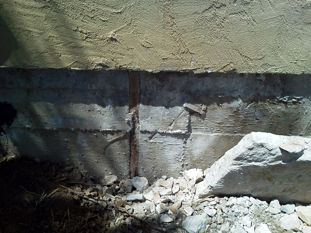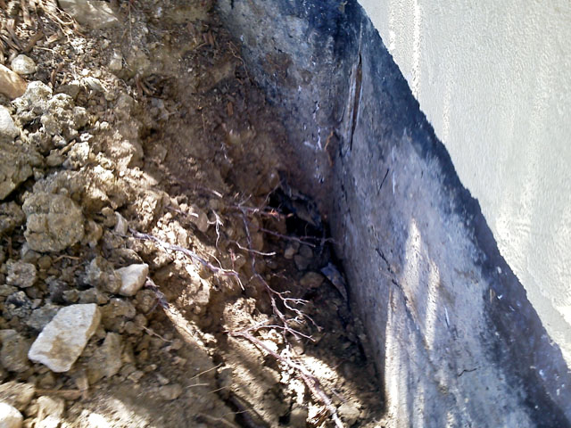 Here's the custom concrete / wood stem wall with the builder's version of waterproofing.