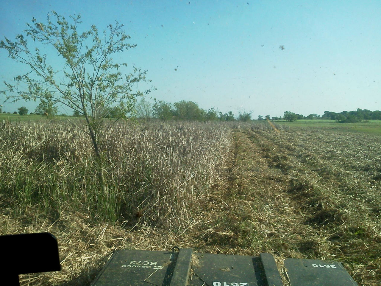 The cutter is 72" wide and a rental from my Kubota guys. It's a Bradco and only has two blades, but the rotation is reversible. It cut okay, but not great. It was very handy having the side discharge for cutting the tall reeds though. Actually, with that much material to cut it was better to go through it at a fast clip, cutting 1/3 of the deck width with the cutter three feet off the ground to keep blade speed up. Then reverse cut at two feet, another forward cut at one foot and reverse again close to the ground. The ground below was pumping water or muddy and the mosquitoes were thick on the side windows. Tough stuff!