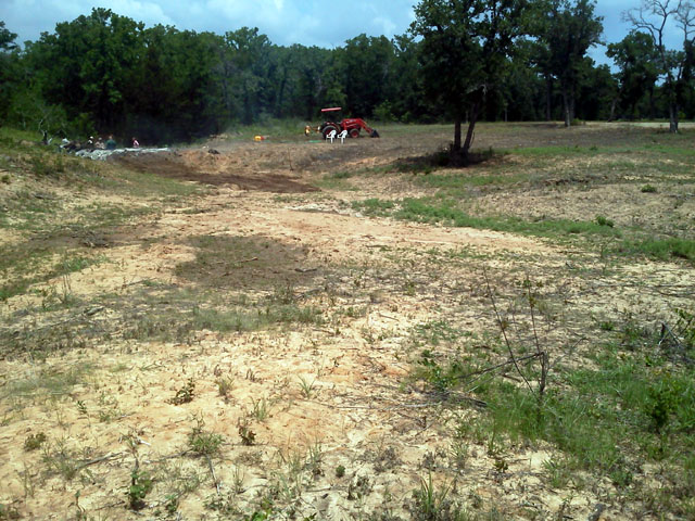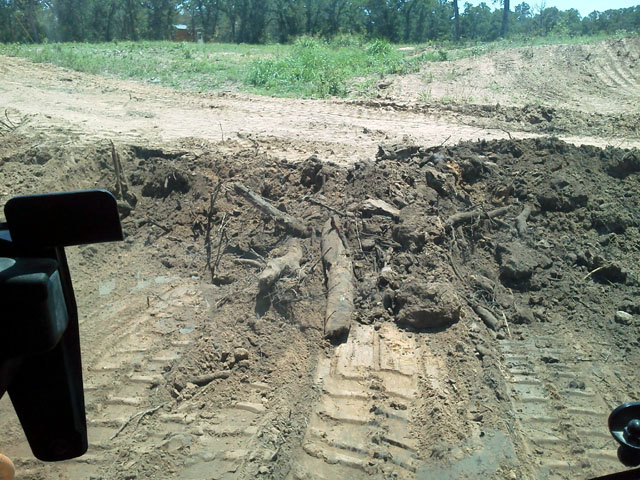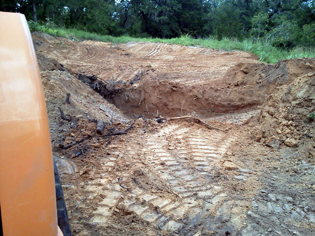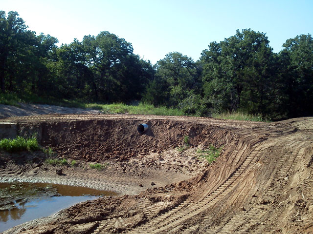 As I mentioned...I was on an owner induced time restraint. I wanted to dig an overflow channel, but time didn't allow. I wasn't too worried, since the dam area should have plenty of time to settle over the summer. After all, it never rains in Texas in the summertime...WRONG! :rolleyes: Fifteen inches of rain fell in this area over a twelve hour period a few days after I left. The water quickly rose to the the overflow pipe in newly compacted soil...the pipe couldn't handle the amount of water and my dam and pipe slowly sank down about five feet. :eek: