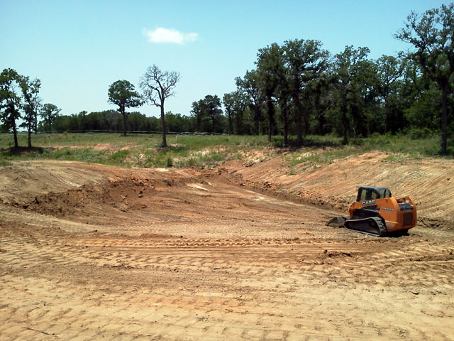 Here's a pond that I dug. It was placed at the bottom of two ravines. I was on a time restriction and the placement was iffy at best. Several types of soil onsite, from powder sand to clay. All of the material had to be shuttled to different areas. Sand to the arena, junk for fill and clay for the dam core and bank, and the halfway decent stuff for covering the junk.