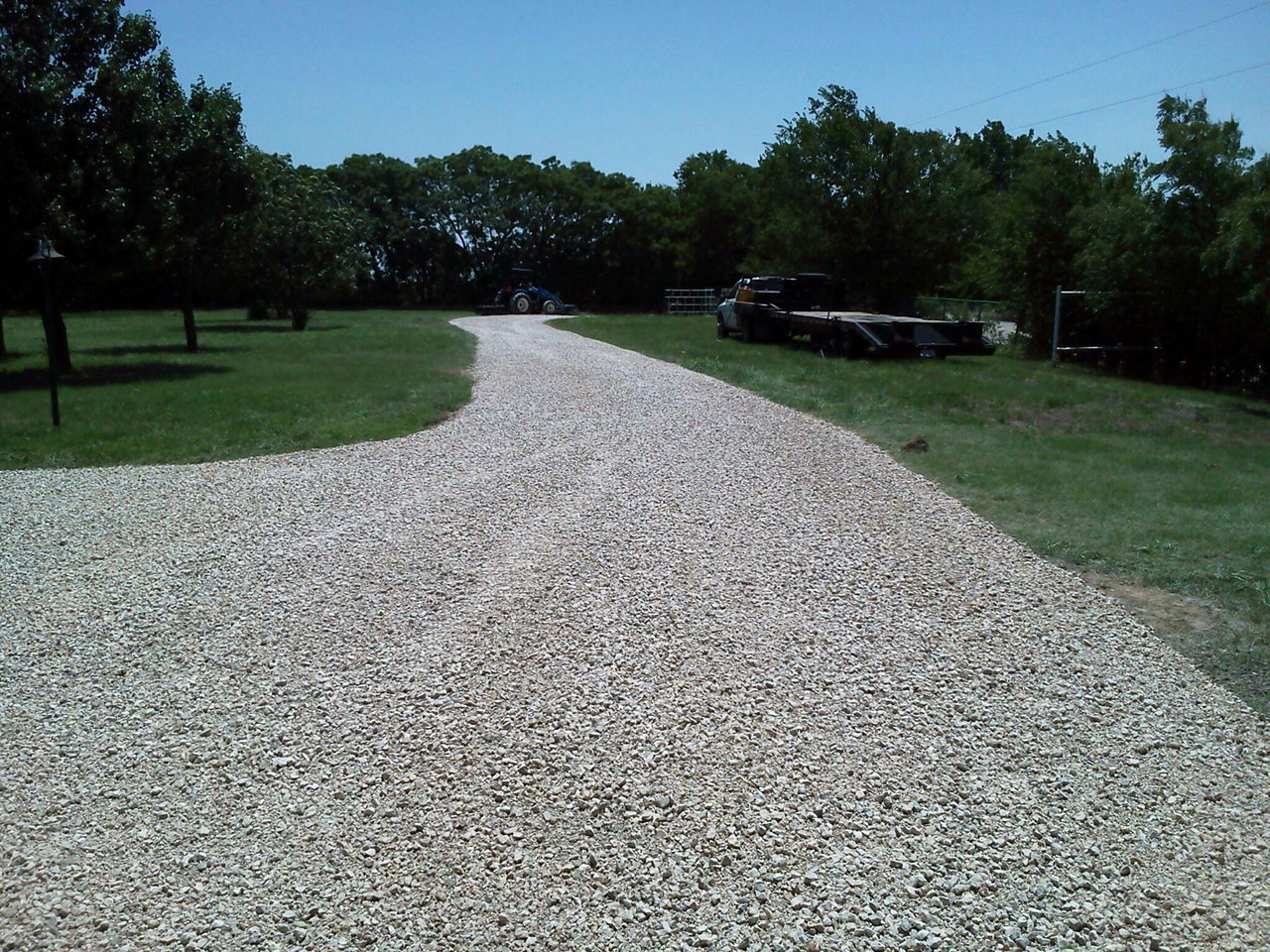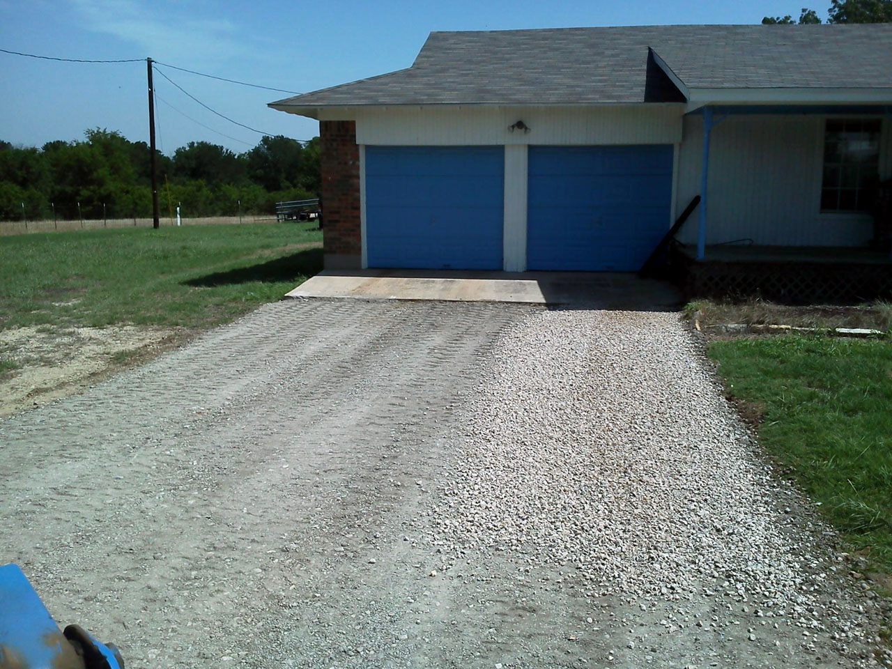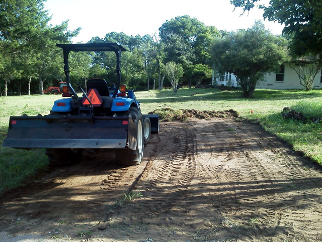 This driveway had quite a bit of base on it in spots, but the thickness was inconsistent and the grade was done wrong. Four potholes developed about 10" deep. I ripped it deep, then mixed the base and dirt together and regraded. I knew that the base and topping loads would arrive before I got the drive regraded, so I quick graded a couple of spots for them to dump.