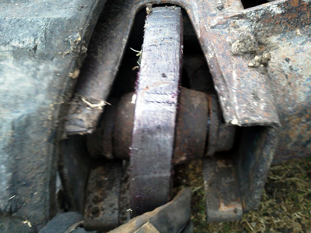 I failed to take a photo of track removal, so this pic is in here twice. I learned this trick from Willie over on HEF and it works slicker than snot on a doorknob. Place a few pieces of pipe between the track lugs on the bottom near the idler. Get in the machine and reverse travel to get the pipes up on the idler so that the track lugs clear the idler. It works just fine with pipes between every other track lug, but I have extra pipe so I use them. At this point I use my tractor and a chain to slide the track clear of the idler track. I've heard that this can also be done with a couple of cheater bars in a pinch. In the last pic you can see that the bearing is long gone.