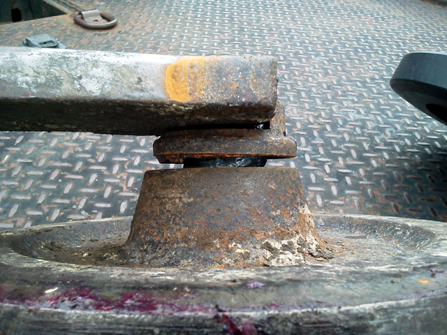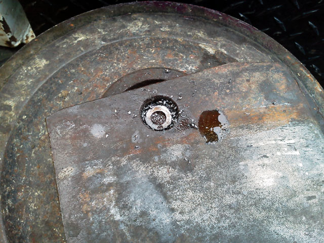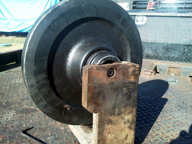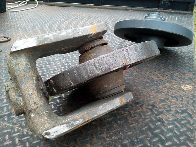 With the track out of the way, the idler/yoke assembly slides right out. (If I were changing out the track adjust assembly, it slides out next.) I don't know how much the idler/yoke actually weighs, but it's upwards of 150lbs. It's heavy. On the bench (my flatbed) you can see how bad the bearing actually is.