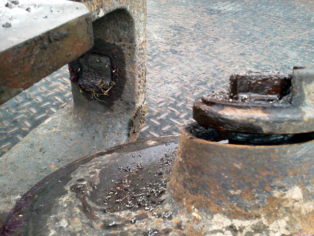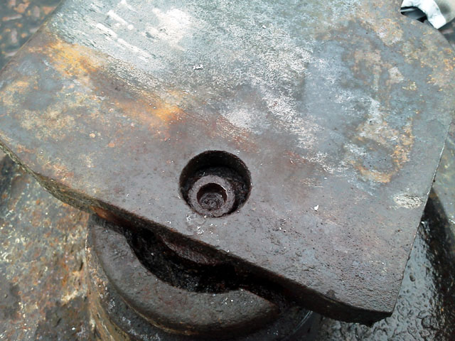 The idler sits in a slot in the yoke and is located by socket head cap screws on each side. The flats were rusted out and gone on the inside screw, so I had to drill it out far enough to slide the idler out of the yoke. Since I knew (from previous experience) that my hydraulics may bleed down enough for the bucket cylinders to block opening the door, I placed a 4x4 in there to spread out pressure on the track lugs and lowered the machine.