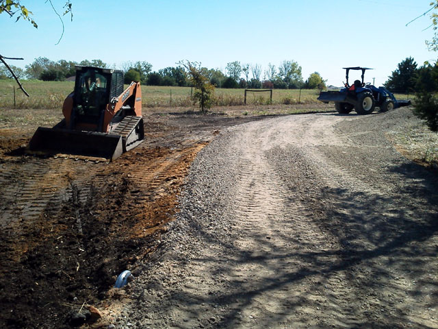 Got the remainder of the road base in along with some drainage grading. The builder's subs are in and out of this place at least twenty times a day, over and off driveway edges, over flow lines, over and around flagging. Makes me want to stick a bucket tooth or two through a few vehicles.