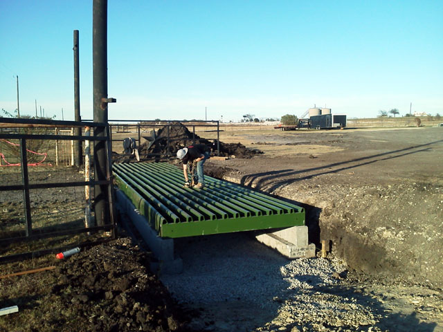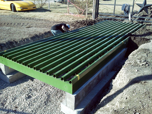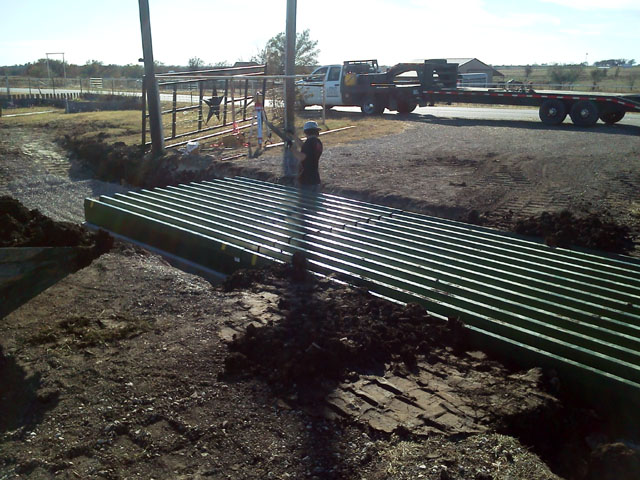 Here's a little change of pace. A local business purchased 34 feet of modular cattle guard, rented a backhoe, and had their guys try to put it in. After three days they got two 12 foot sections in, but they were 8 inches out of level and out of square too. There were several factors that led to the problems the guys were having. First, they tried to set the footers on black clay. And not their fault...but they were using a string level not realizing that the footers were slightly off on the top to bottom, side to side and bolt center measurements. To top it off...a couple of the footers were bulged in the middle. The grates had plenty of end to end adjustment built into them, but only 1/4 inch of play side to side. With the help of my stepson, we pulled the steel grates off, ranked out the footers and started over.