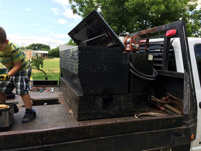 I welded up some brackets to mount my old tool chest to the new tank and bolted it down. I plan to get a new heavy duty tool chest that sits flush with the top of the tank, but for now this will have to do. Out came the plastic Craftsman box and all of the other "need 'em now" tools. The tool chest now houses all of the fluids I need to have along and straps, bottle jacks, seldom used tools, etc.