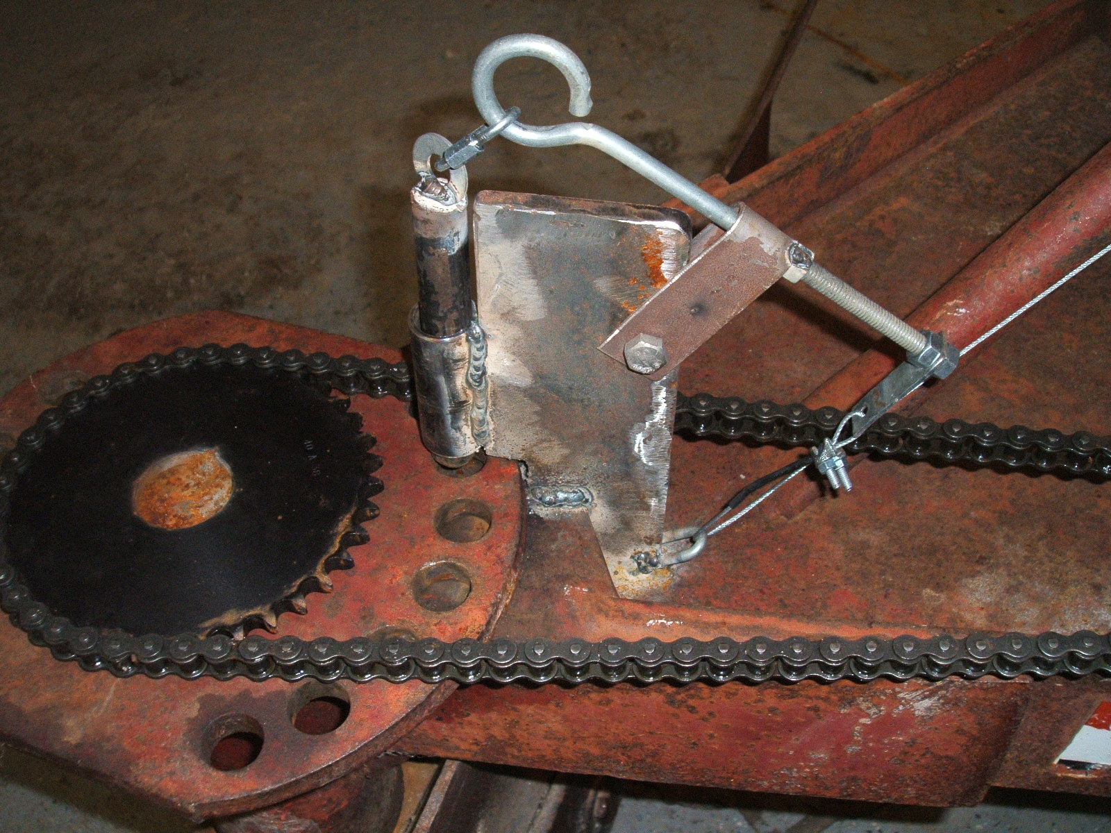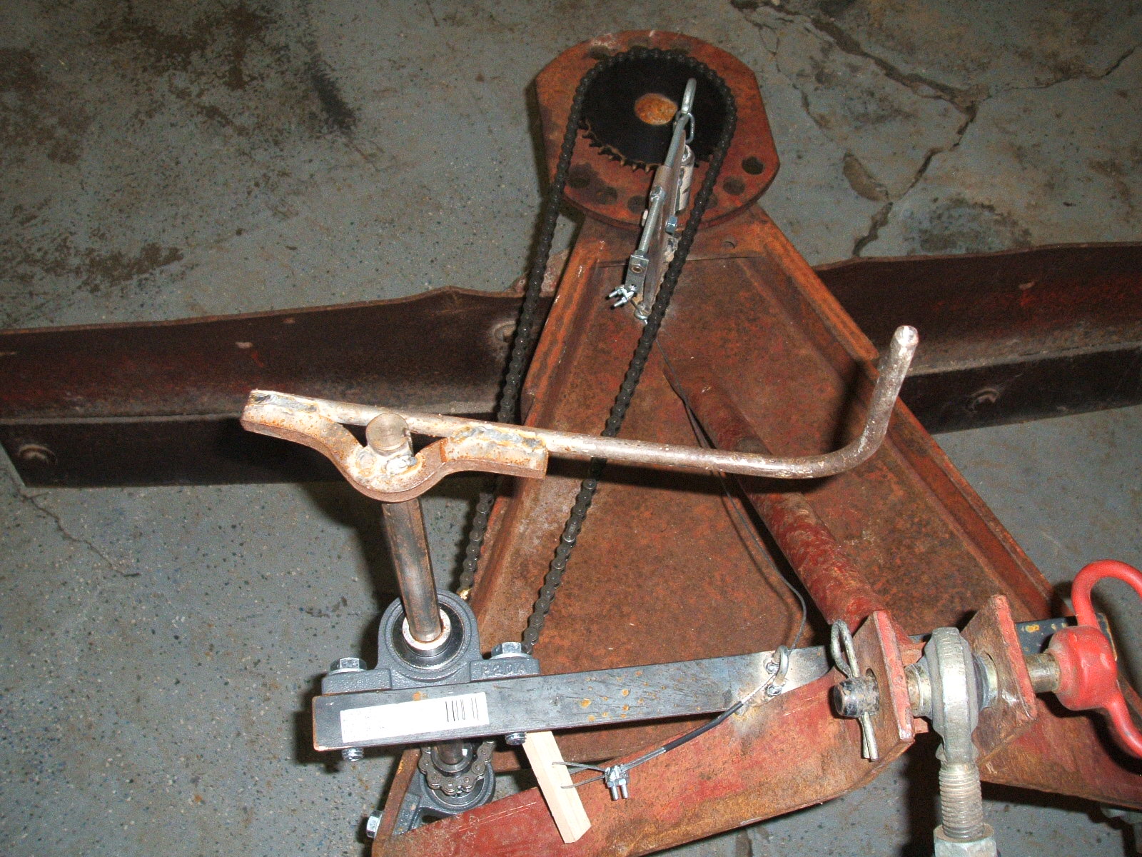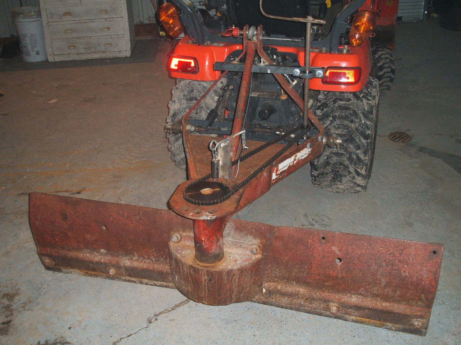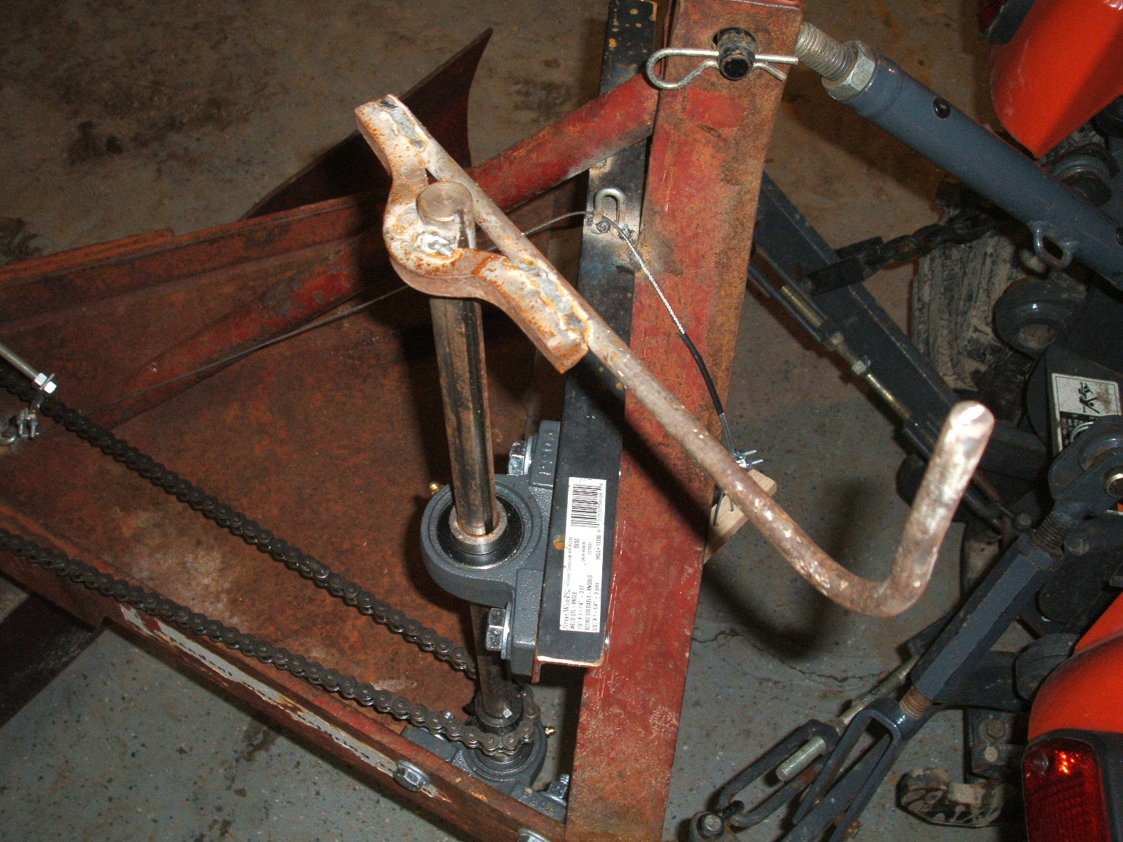 I use the rear blade on my BX24 for clearing snow on my driveway and several neighbors. Sometimes I pull the snow and sometimes I drive in reverse pushing so I needed to be able to rotate the blade completely. I was tired of jumping on and off each time I wanted to change the position of the blade so I created a manual rotator. The shaft, bearings, and sprockets were from Surplus Center. The chain and wire were from the local hardware store. The rest of the metal was lying around the garage. Now when the cable is pulled while in the driver's seat, the locating pin is lifted up and the blade can rotate freely. To rotate the blade I simply turn the handle while the pin is up. When I get it to the correct position I release the cable and the pin falls back into the locating holes. So far it has work perfectly. The blade can rotate 180 degrees and in either direction. Since i know nothing actually happened with out photos, here they are.
