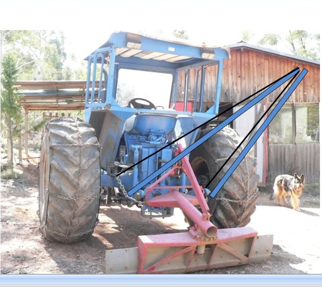 - The "back stay" (actually faces to the front of the tractor) will be a heavy cable running from a mounting point on one side of the tractor through an adjusting block and back to the other side - this controls the height of the frame. OR it may be easier to simply affix the head of the rig with chain that can be adjusted for length with a rated shackle .