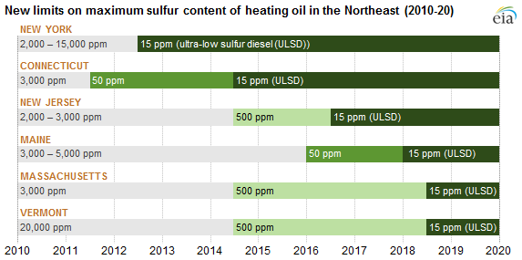 Currently in NY state, Home heating oil has <15ppm sulfur. As of July 1, 2014 HHO will be required to be <15ppm in CT. and most all N.E. States will follow in later years.