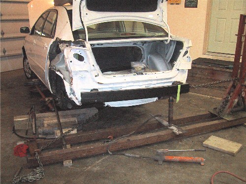 You can see the chains attached at the bumper supports. In one photo we are pulling the left rear of the car back and in the other set-up we are pulling the rear of the car to the right. On the left set up an extra pulling jack is connected to the tower and crease of the rear fender well. You tend to pull on the crumpled stuff so if it tears it's going to be replaced anyway. Once a pull is set up you hammer on the crumpled creases and the metal straightens out, thus the term "bump shop"