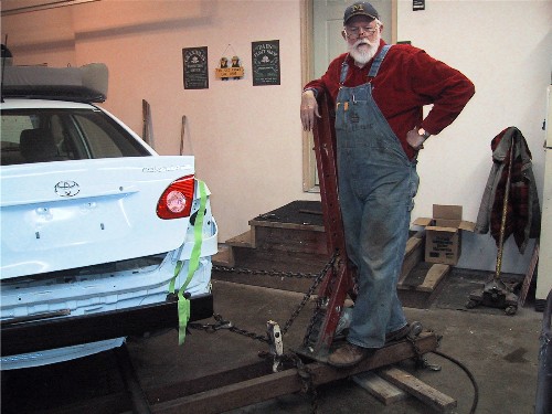 Here are pix of the "tower" which sits on 2 -10' channel irons that are reinforced and slide under the car and chained to the car. The tower has a heavy duty jack and pulley system that delivers 40,000 lb of pull. That plenty for these compact cars. On the tower the pulling chain and other chains can be hooked at different level and even routed to pull at an up or down angle. The whole tower assembly is braced and anchored to the car to get a pull in the direction you want. My neighbor Dave is a genius at setitng this up.