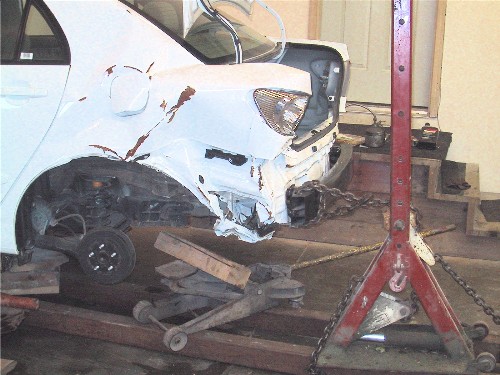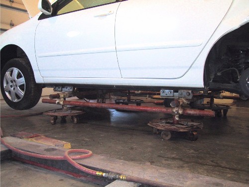 The first thing is to get a hold of the car so you can do some serious pulling. This involves attaching a jig to the rocker panel creases at all 4 corners and then connect all together with steel pipe.