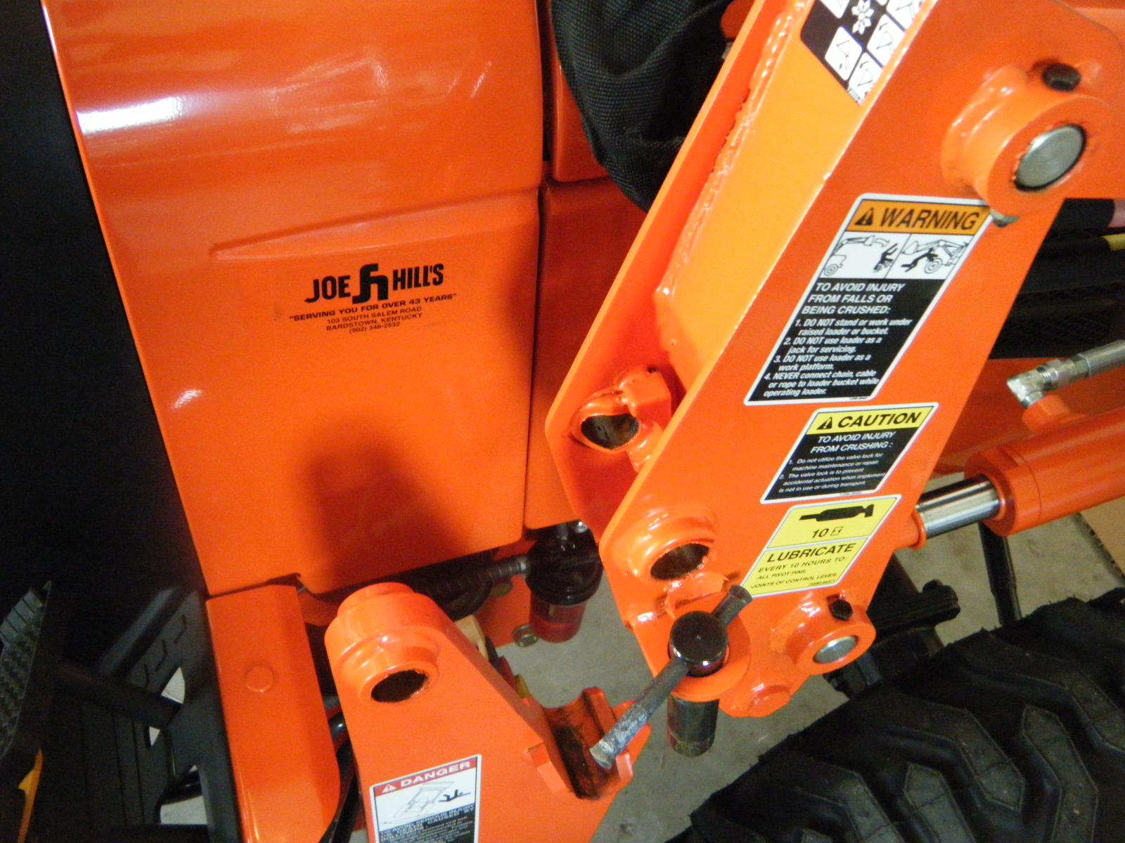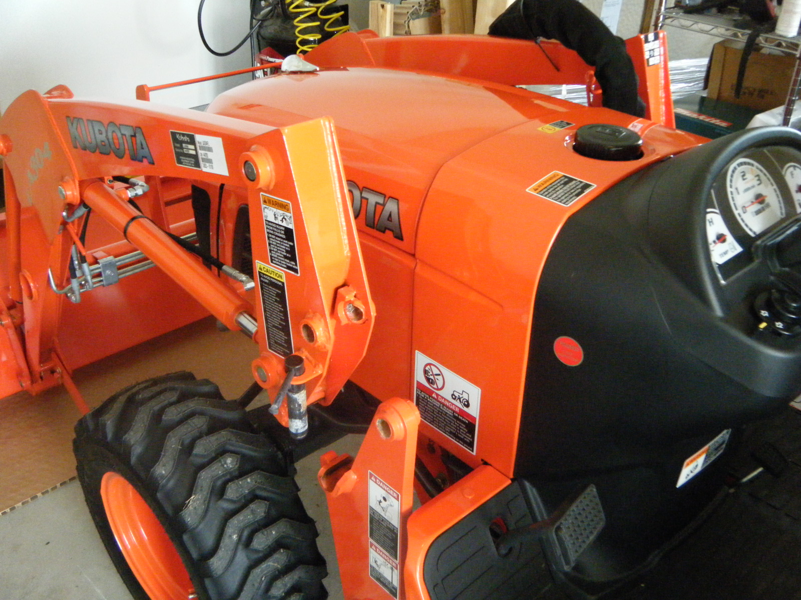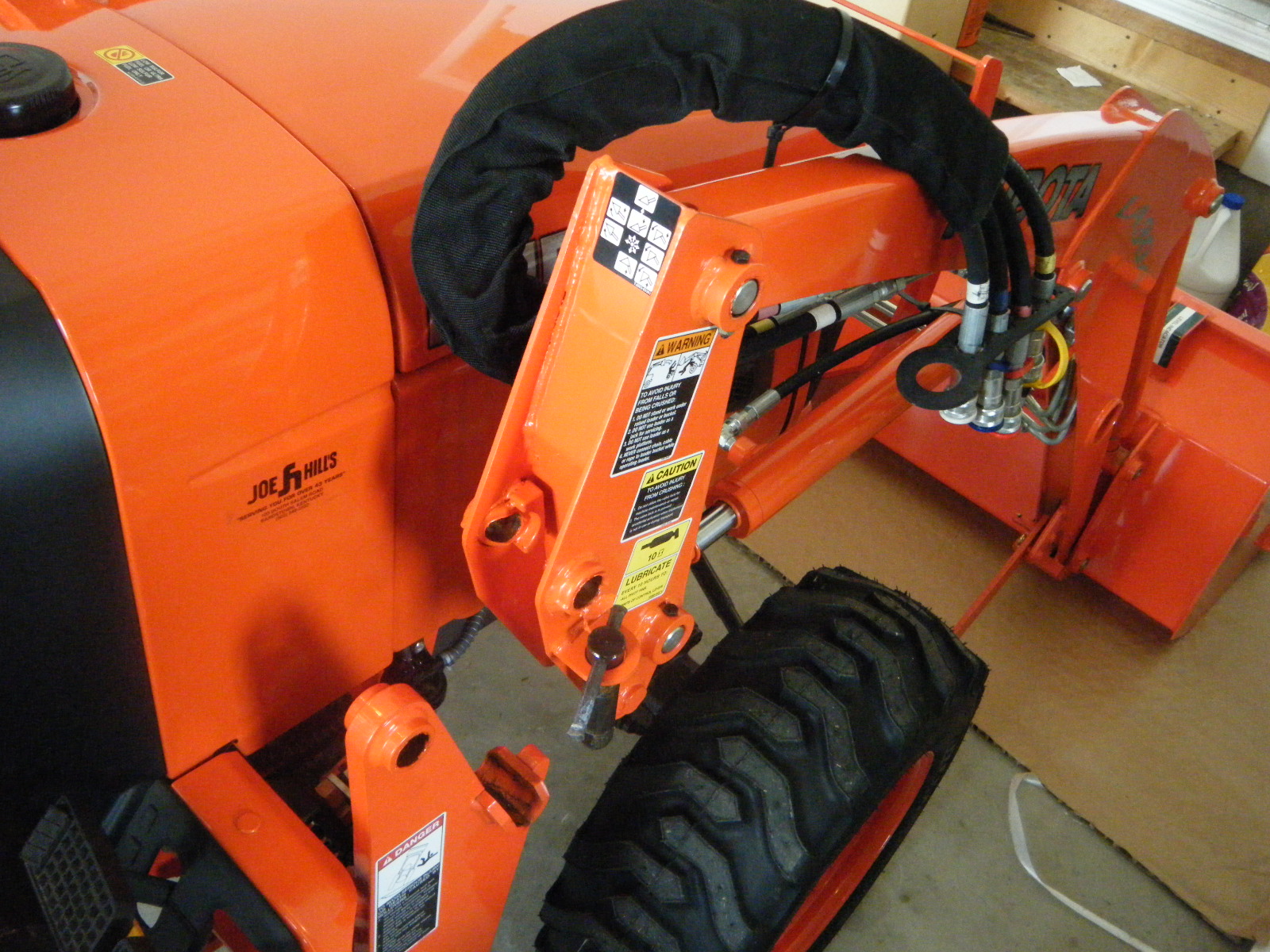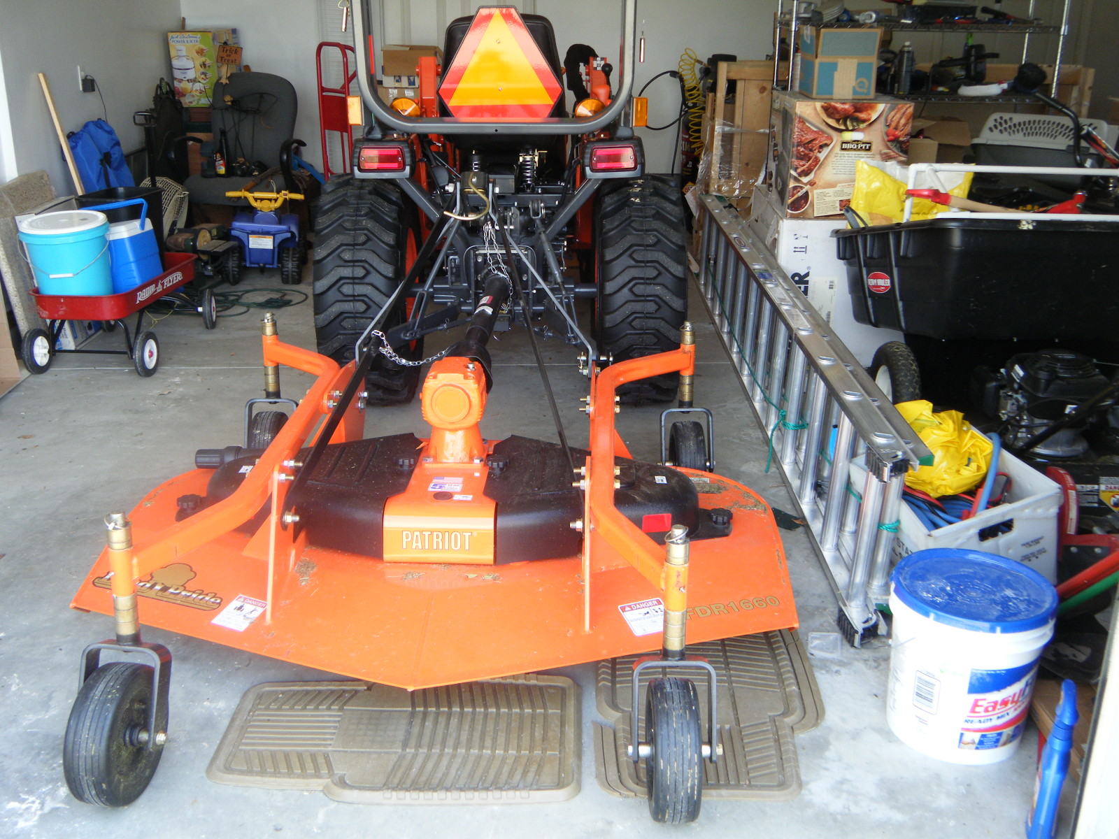 Never mind the cluttered garage (a man will resort to all kinds of things to make a new toy fit and nearly take a cussing from the wife explaining why room wasn't made for her car). Anyway, I decided to take the FEL for two reasons, 1. to learn how and 2. make things easier while mowing. It was pretty simple to do. Followed the instructions but didn't really lift the front wheels, or at least it didn't appear to . After lowering the stands, I lowered bucket and rolled it slightly keeping pressure off stands. The right side pin pulled out easily. The left pin was a little stiff so I bumped the control lever a second time and it too slid out with no effort. Then rolled the bucket back slightly and it lifted out perfectly. This is a lot simpler than it appeared to me.