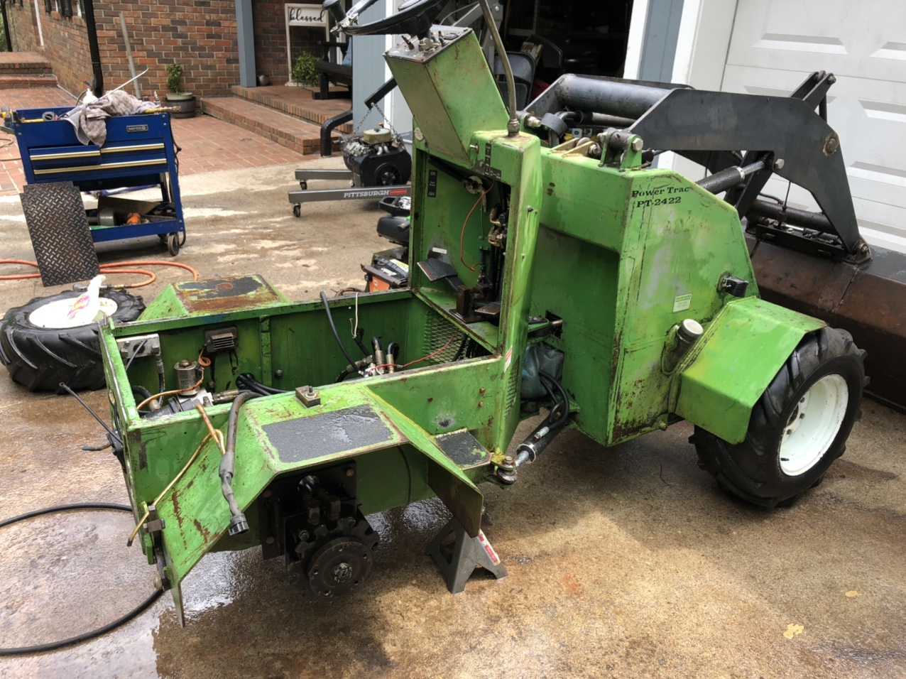 Well my starter started acting up so i decided it was time to pull the engine and do the repairs i have been needing to do to my PT. My parking brake cables were getting to the point where they would not work properly so i am pulling them both out and servicing them by cleaning the cables, flushing out the cable casings and streching the springs a bit then reinstalling them. I orderd a new engine harness and will be installing it along with the starter.My choke cable never worked since i bought it ( it has a small cable to pull on the engine to start). After i removed engine i found out the engine mount plate welds were broken so i will have my welder get it repaired as well. There was about 2-3 inches of dust- oil- leafs- etc in the pan of the engine bay so i was having fun getting all of that out too. My Lovejoy couplers were pretty worn so i have them on hand also to replace ( i already have a extra set ordered for when i was going to do this planning ahead). Everything for the most part was difficult considering everything was wet from old hydraulic lines-and the old pump leaking, But once i removed the 4 bolts holding the engine to the mount plate it was all downhill so to speak. I have to wait untill after the holiday to get it back together, but when i am done i think i will have everytning working like it should.