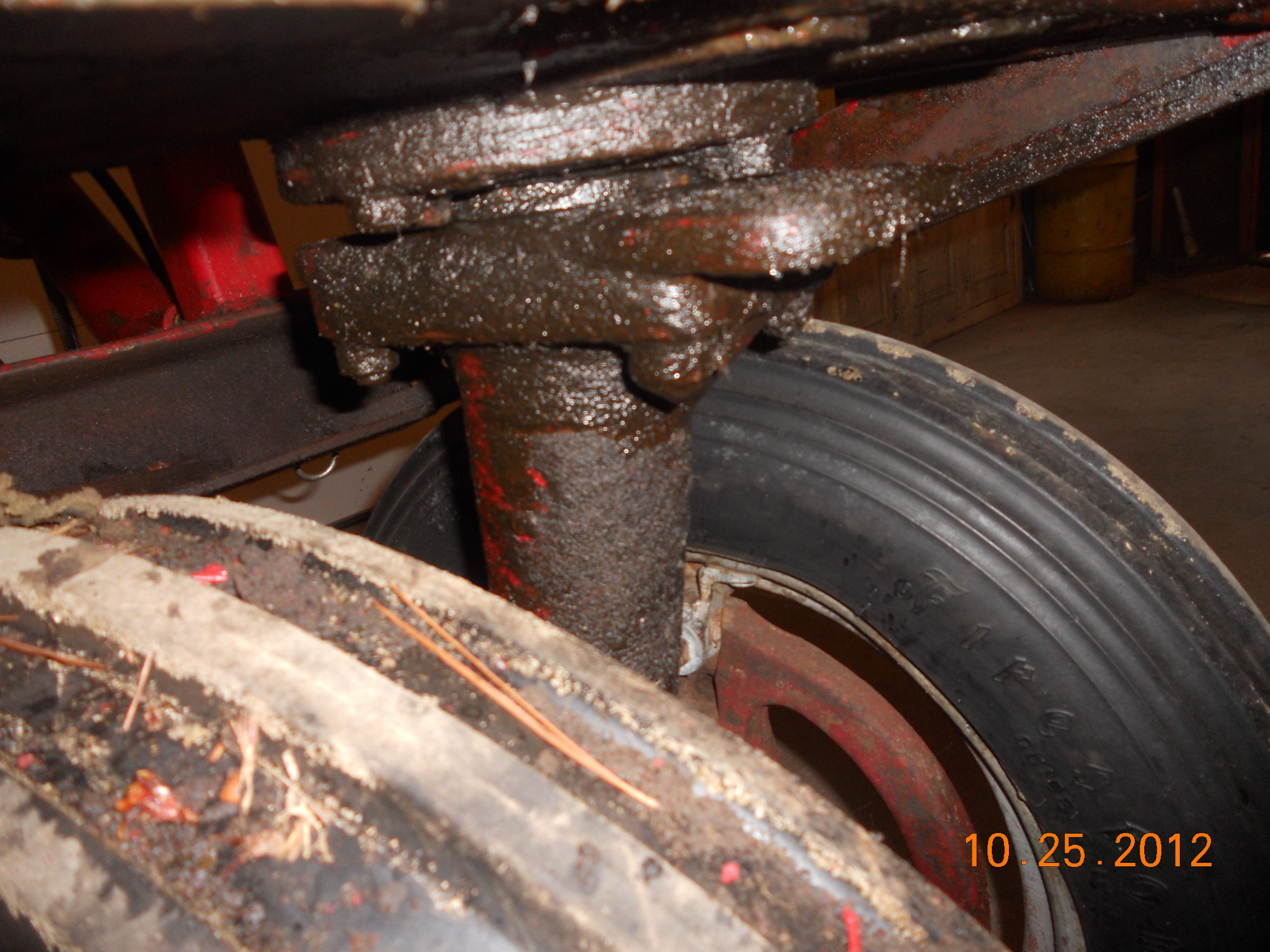 The front axle is covered in oil (Photo # 3) that I am guessing leaked from the housing the axle inserts into because the housing is empty of oil (looks like it holds a quart or so of oil). In addition my guess is the seal in the housing that the steering rod connects to (photo # 2) needs to be replaced too since that is empty of oil too.