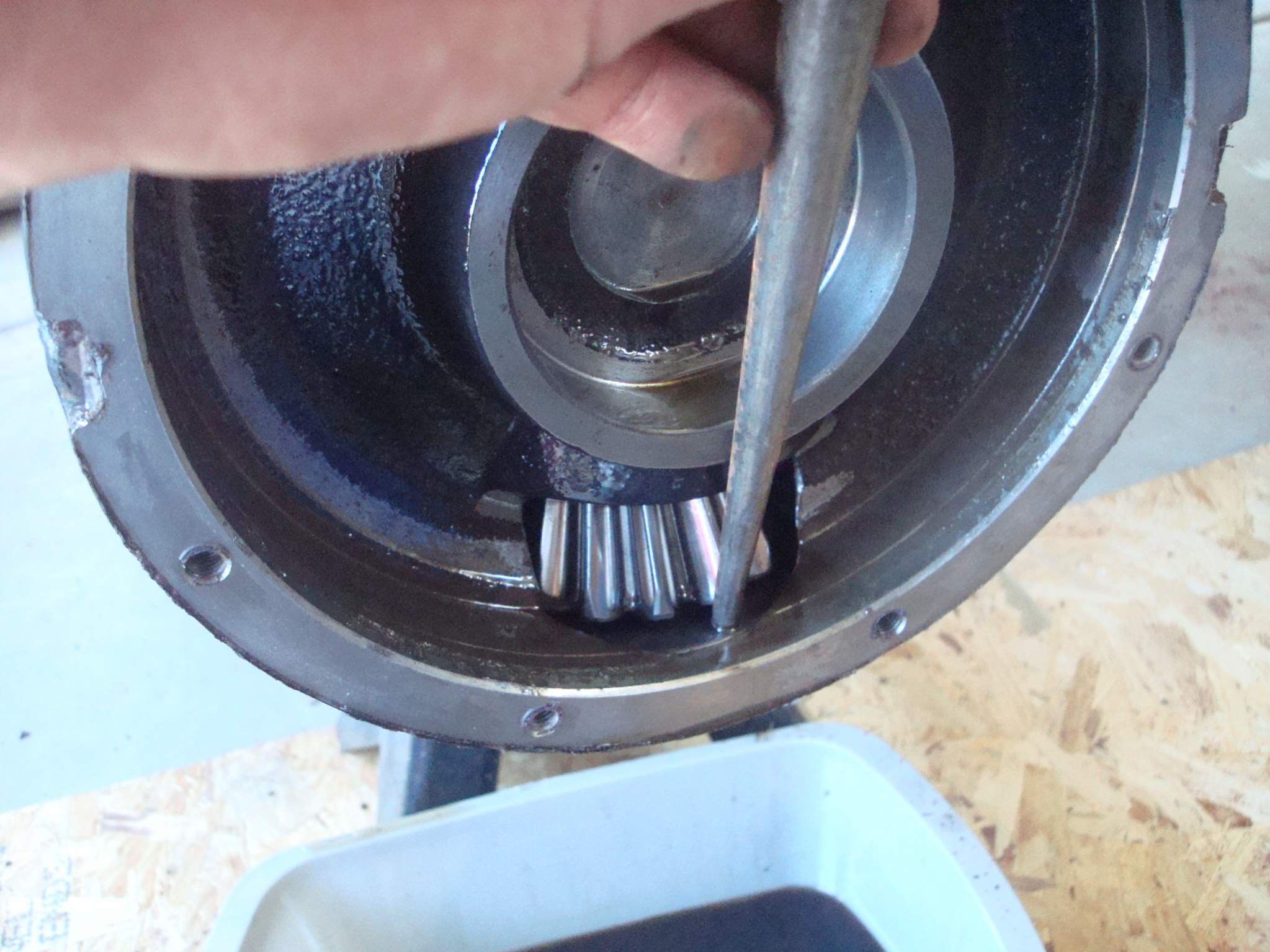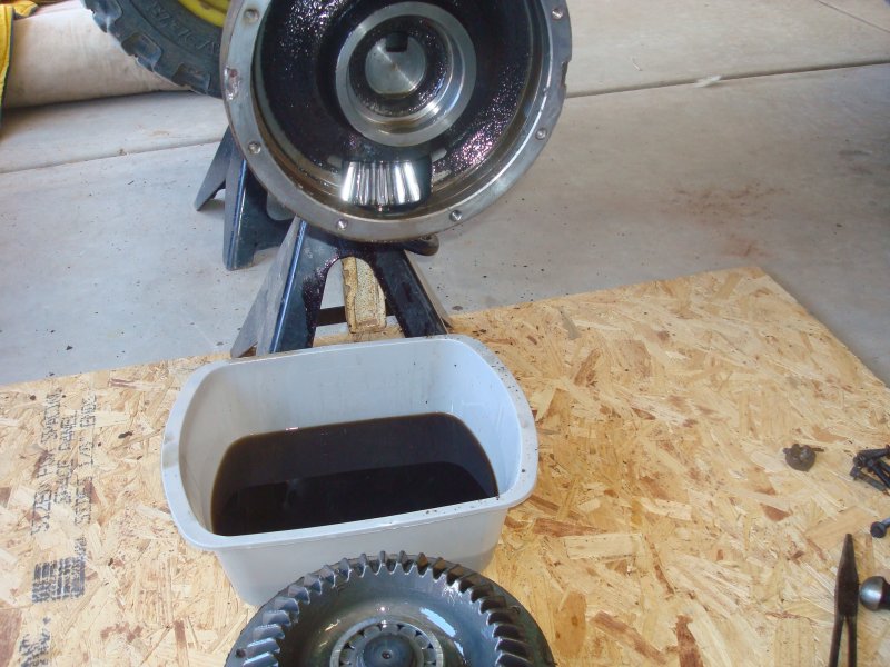 Tighten the spindle nut allowing for a good pre-load on the bearing. Install shaft, big internal snap ring, bevel gear, small external snap ring. I installed a new bottom cap with a little silicone and tapped it in. Apply thin layer of silicone to surface of spindle housing where the wheels shaft cover mounts. Install wheel shaft cover and tighten the 8 bolts to spec. Install drain plug and fill with recommended fluid.