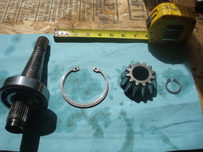 Reach up into the bottom and remove the small snap ring and the bevel gear will fall out. Next, remove the large snap ring. THIS SNAP RING IS MANLY. My cheap chinese set of snap ring pliers couldnt do the job and I ended up with a blood blister. Had a buddy bring over his Channel Lock snap ring pliers and they did work well. Remove the big snap ring and the shaft and bearing will fall out.