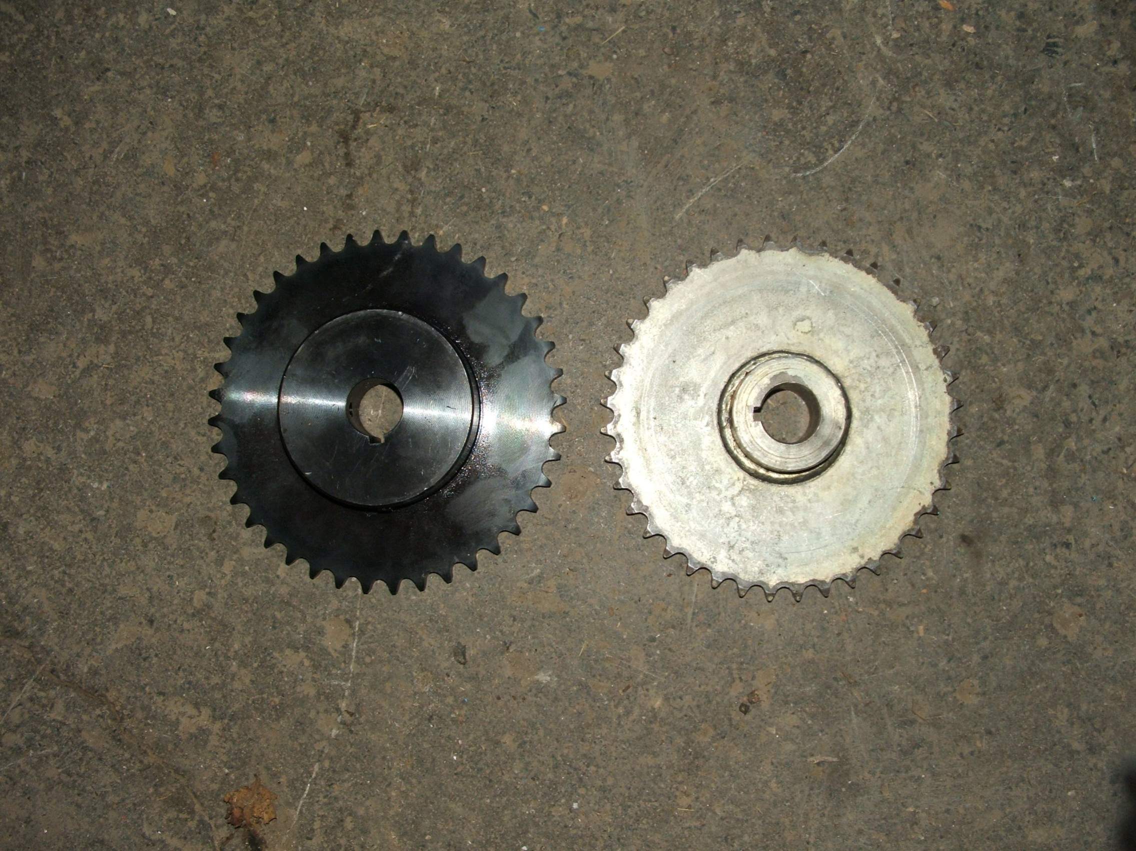 Ok, so here is a follow up on the large sprocket I brought to my dealer. Sorry I'm a little late, but you know how it is before Christmas. Just a quick recap, The large 40t sprocket on my 47'' blower was wobbling side to side, possibly cause by a bend in the sprocket and also as mention by Turbo36 the inside bore of the sprocket seem to be a little large for the shaft. All this made it hard to adjust the chain causing it to be very noisy. Took it to my dealer hopefully for a replacement on the warranty even though the warranty is issue. Well apparently the sprocket was not bend enough to justify a replacement and the inside bore of the new sprocket they had was the same as mine. I decided that the sprocket had to be change but JD was asking $126.00:confused2: So I went at a bearing dealer and bought a sprocket for $38.00. This sprocket is machine in one piece instead of the original 2 piece sold by JD. It is nice and strait and further more, the bore is the perfect size for the shaft. There is absolutely no more loose on the shaft.:thumbsup: Made sure that both sprocket were well aligned and tight everything in place. Also took the time to replace the chain. Now it is much easier to adjust the chain. Still have some loose on the chain being cause by the small sprocket shaft that is also a little crooked. (Don't know who makes these parts for JD, but not impress at all.):mad: All in all, I have eliminated 75% of the slack and noise of the chain by doing this fix and would recommend it without any hesitation.:thumbsup: Here's a few picture of the old and new sprocket. The new one is black and you can see there is no welding on it.