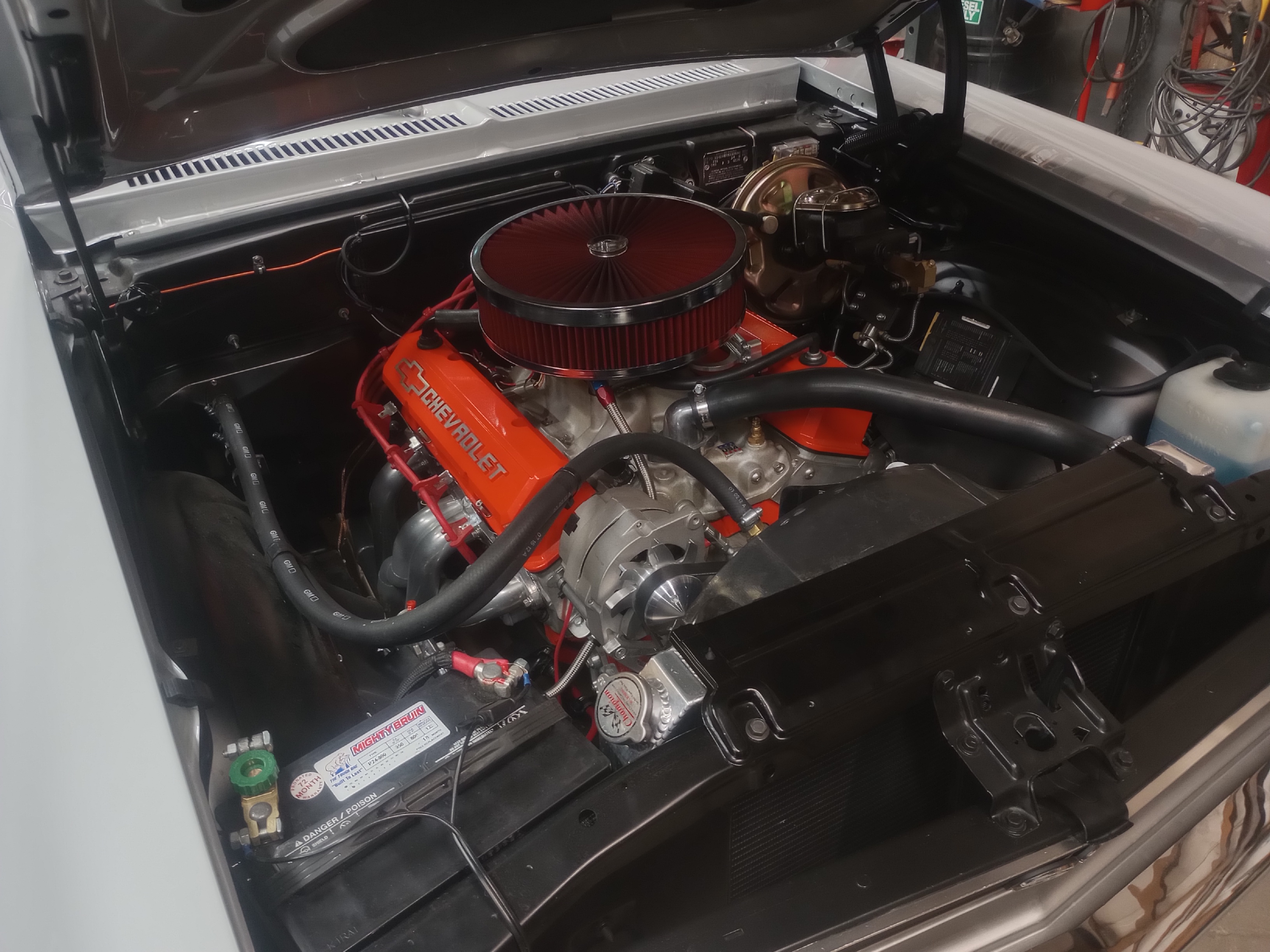 I got the last items finished up yesterday, radiator, hoses, engine oil, set the timing and hang the exhaust. Today, Brian came over and gave me a hand putting the hood back on. That lined up just like it did before no problem.