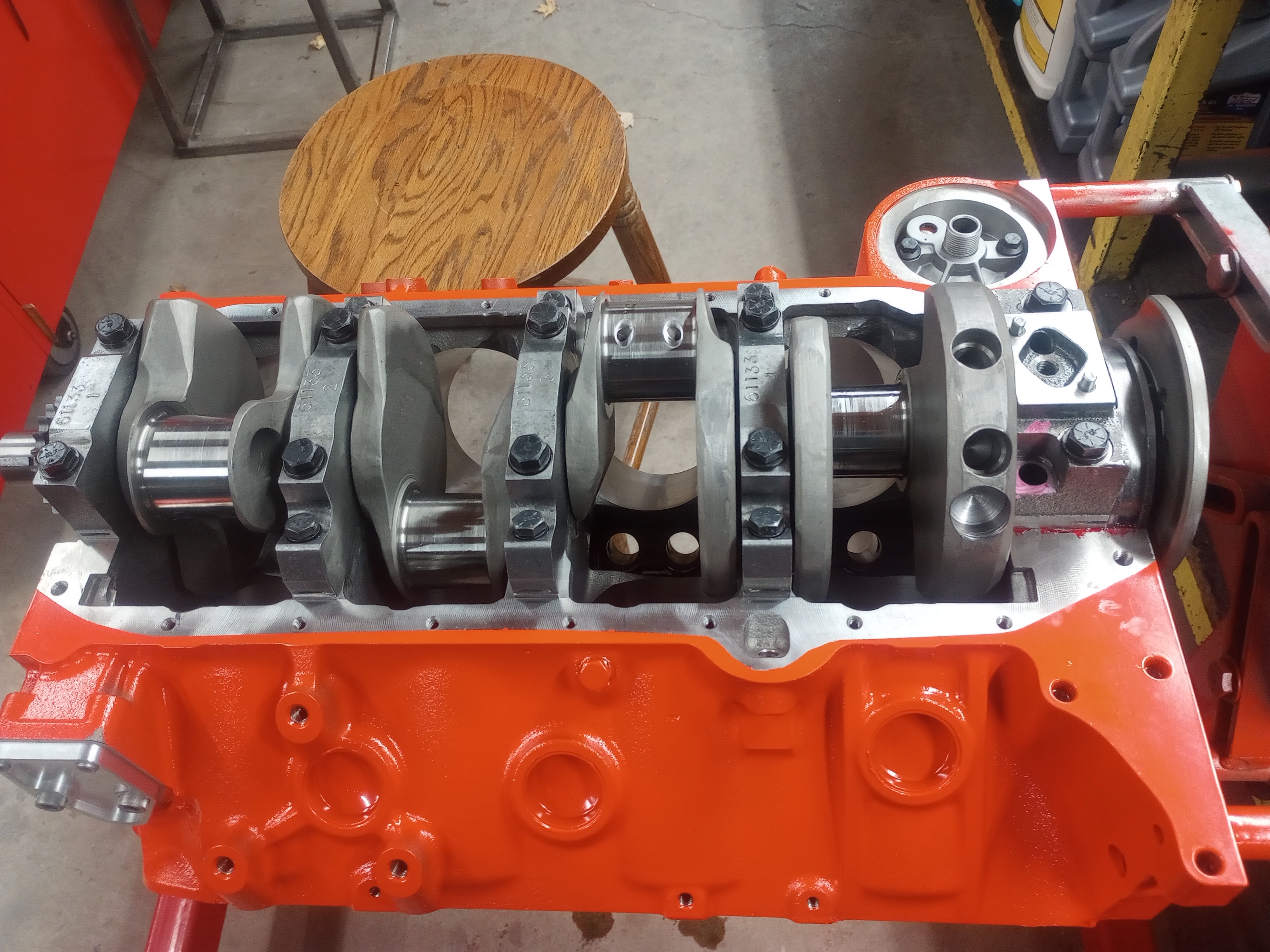 Unpacked the new main bearings and made a small modification to the rear main shells to get more oil the the thrust surfaces, a mod I've seen a few SBC builders recommend. Installed the rear seal half in the block and the rest of the upper bearing shells. Got the crank, wiped and blew it off, lubed the bearings and journals and dropped it in place. Installed the lower shells in the caps, lubed them and dropped them into place. Seated them in the block, installed the cap bolts, snugged them up, forced the crank forward and aft to set the rear cap and thrust bearing properly. Dial indicator show .005" end play, which is in spec. Torqued the 7/16" main bolts to 65 ft.lbs. and the splayed 3/8" bolts to 35 ft.lbs., as per the block specs. The crank even spins nice and freely, which is good!