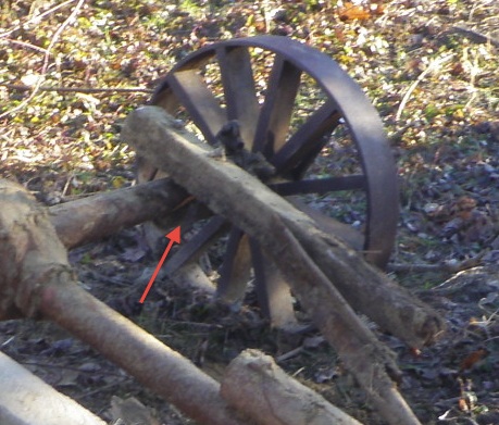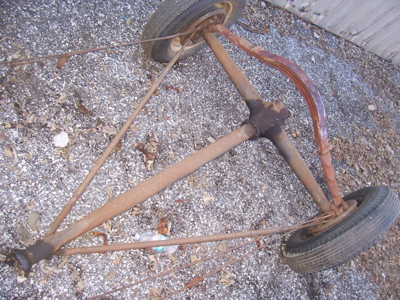 Oh yes, you are right on. It is a collaboration, the rear axle from a model (t, or A) perhaps, the steel wheels from an old sickle cutter, welded onto a 4" pipe. yep a bunch of things put together.