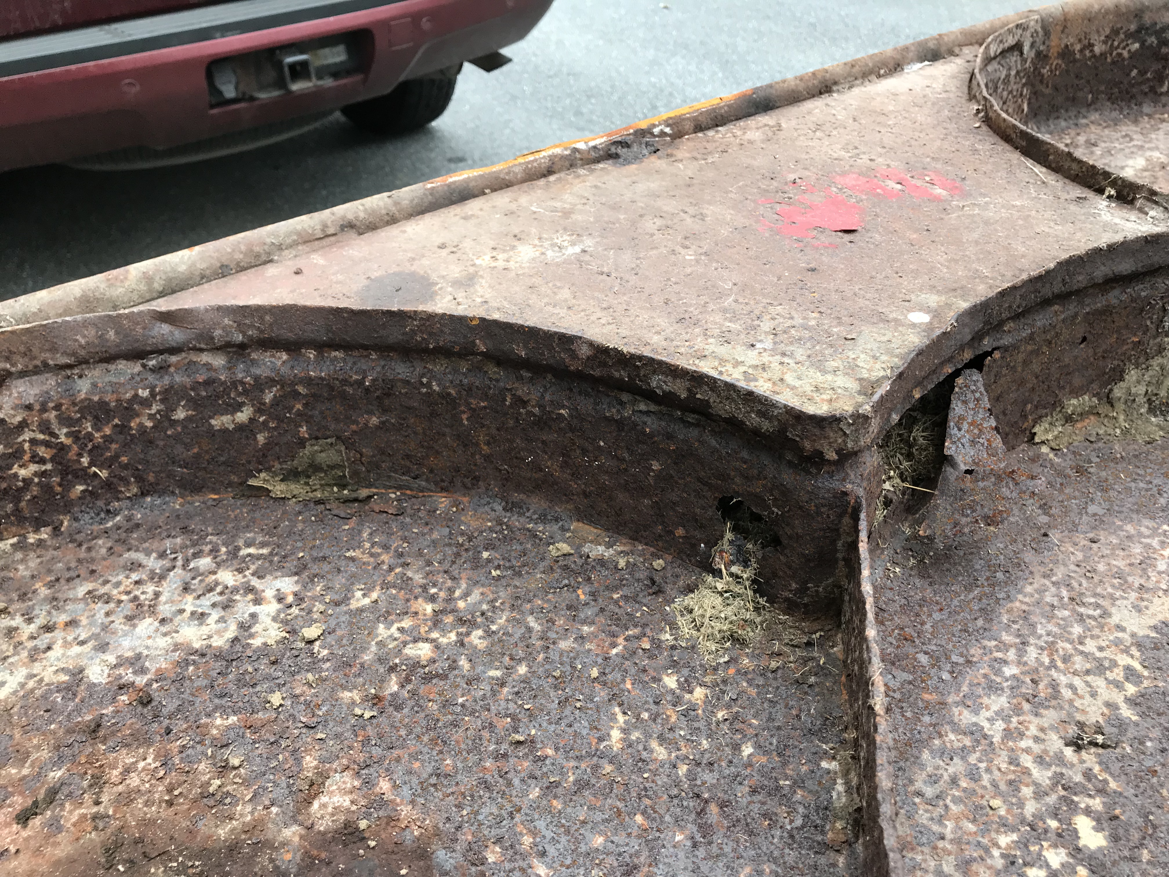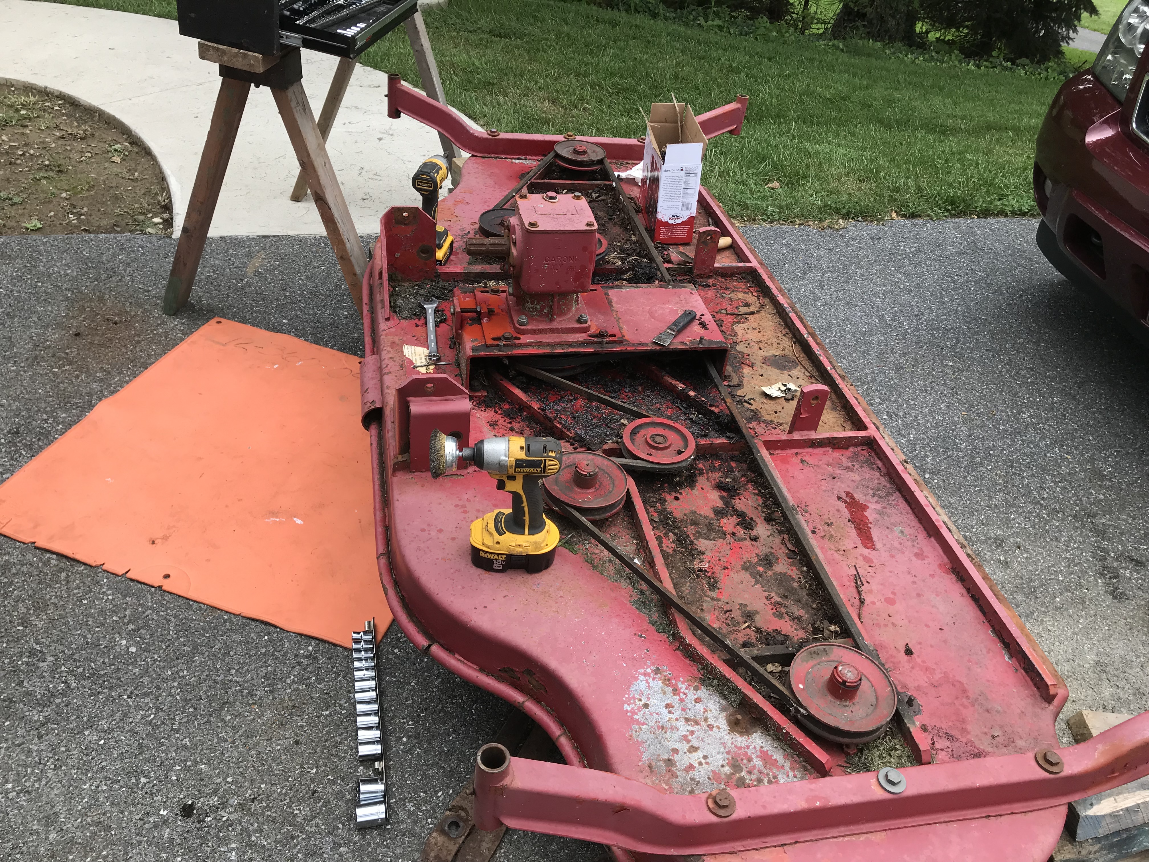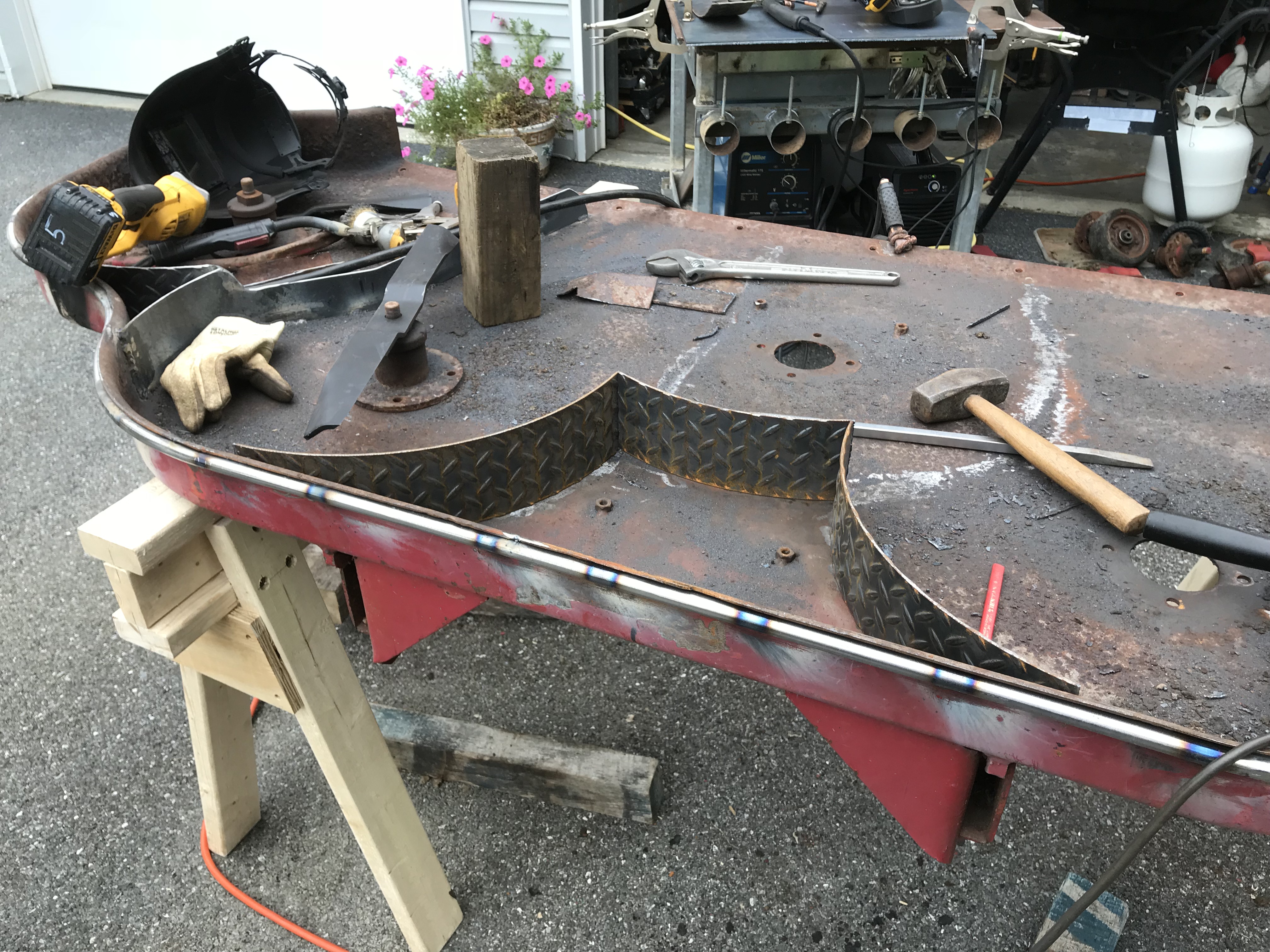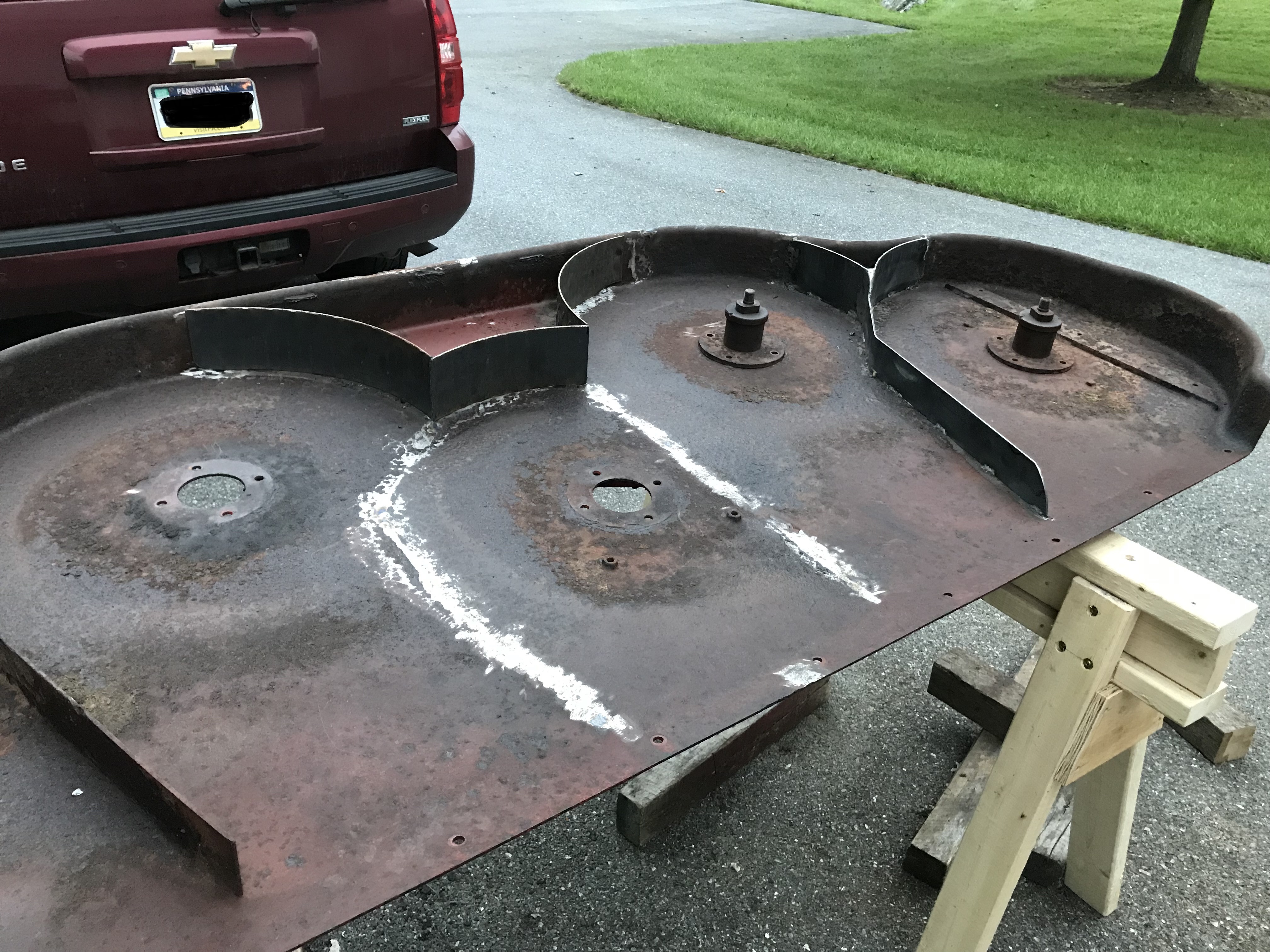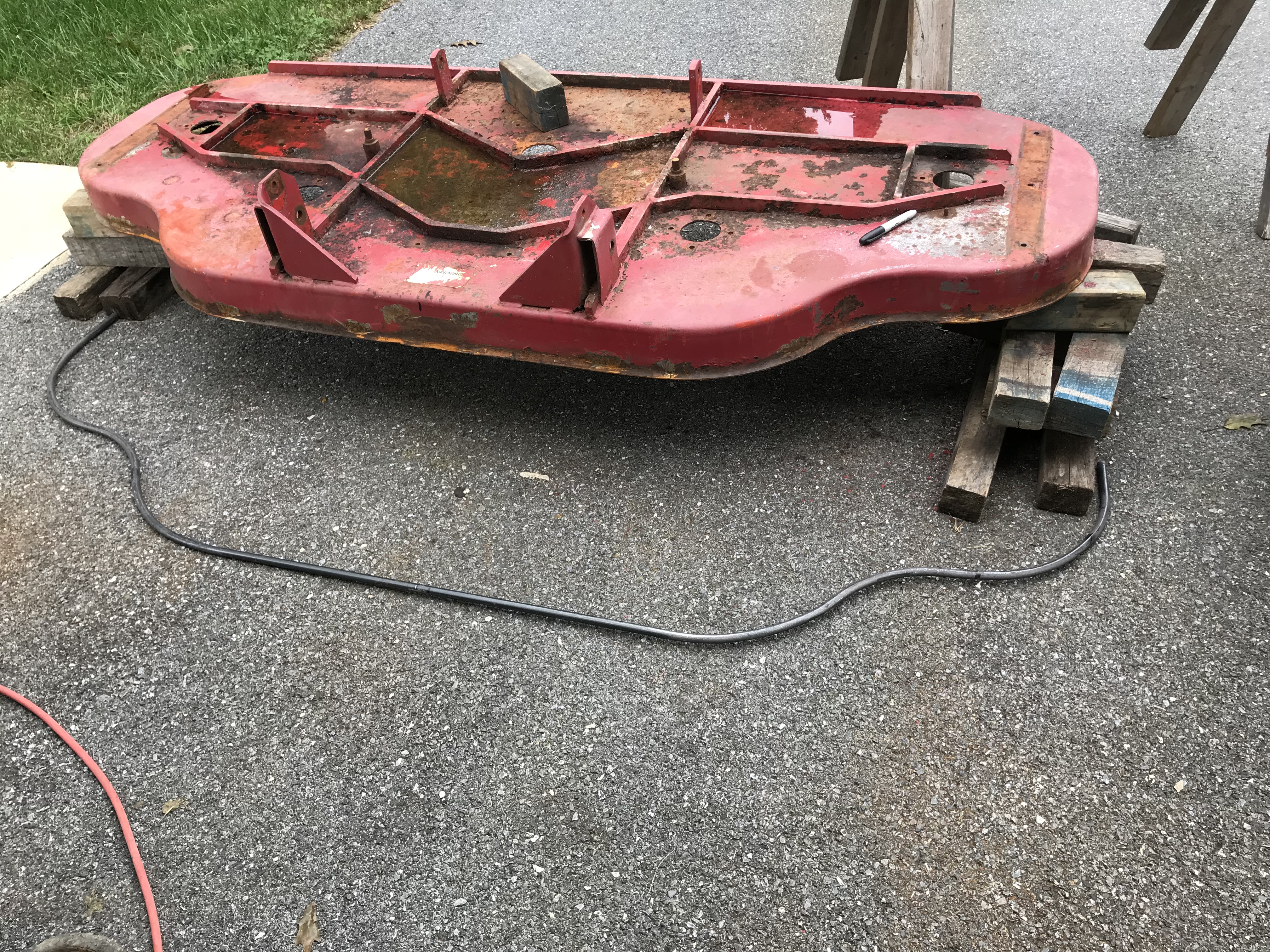 Last Fall I picked up a well-used Caroni TC910 for $600. It was ugly all over but had a good solid main deck. The baffles were in rough shape and needed to be replaced. The wheels and all the supports were still in good shape. There's no inside space that's safe to weld in at home and I thought I could get it finished before Winter set in so the project was done in the driveway. By the time all the bad metal was replaced with good metal, the season changed. Rather than haul it to the shop at work, the pieces were put on a pile till Spring.