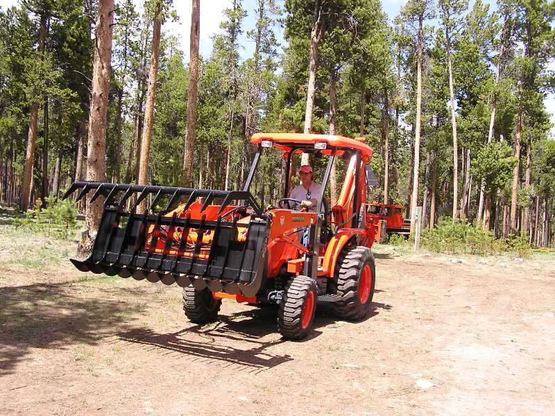 The Anbo rake/grapple for our Kubota L39TLB works excellent for many different jobs. You can use it to rake up a bundle of brush and then grab it and deposit it elsewhere. Dirt will fall out between the tines which are spaced 6 inches apart and are offset top and bottom. It will be one of our most used attachments for the L39.