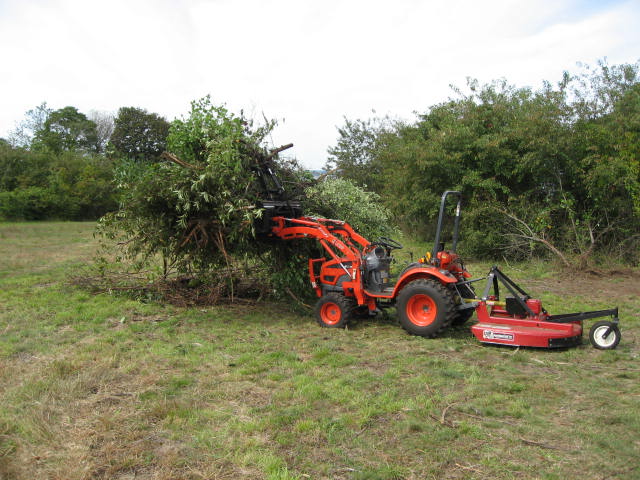 One of the nice things about grapples is that even smaller tractors can do essentially the same job as 50+hp tractors moving brush. 21hp tractor with a $700 grapple works pretty much as efficiently as the big guys.;)